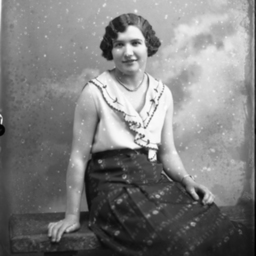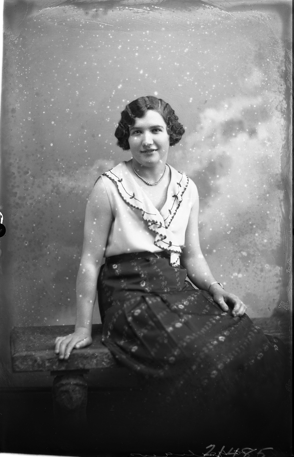 Unidentified woman with short wavy hair is seated on a bench and wearing a necklace with her blouse and skirt.