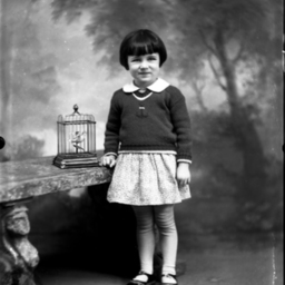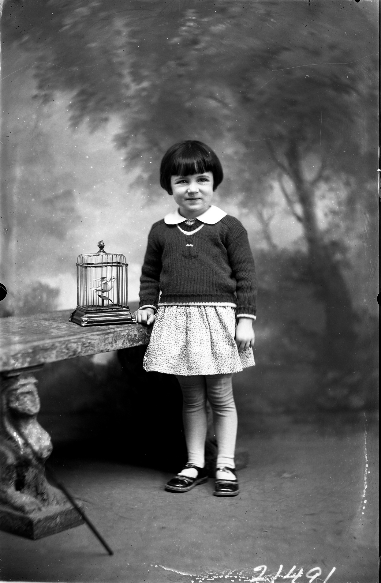 Unidentified girl with short hair and bangs is standing by a bench and a toy bird cage.