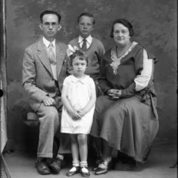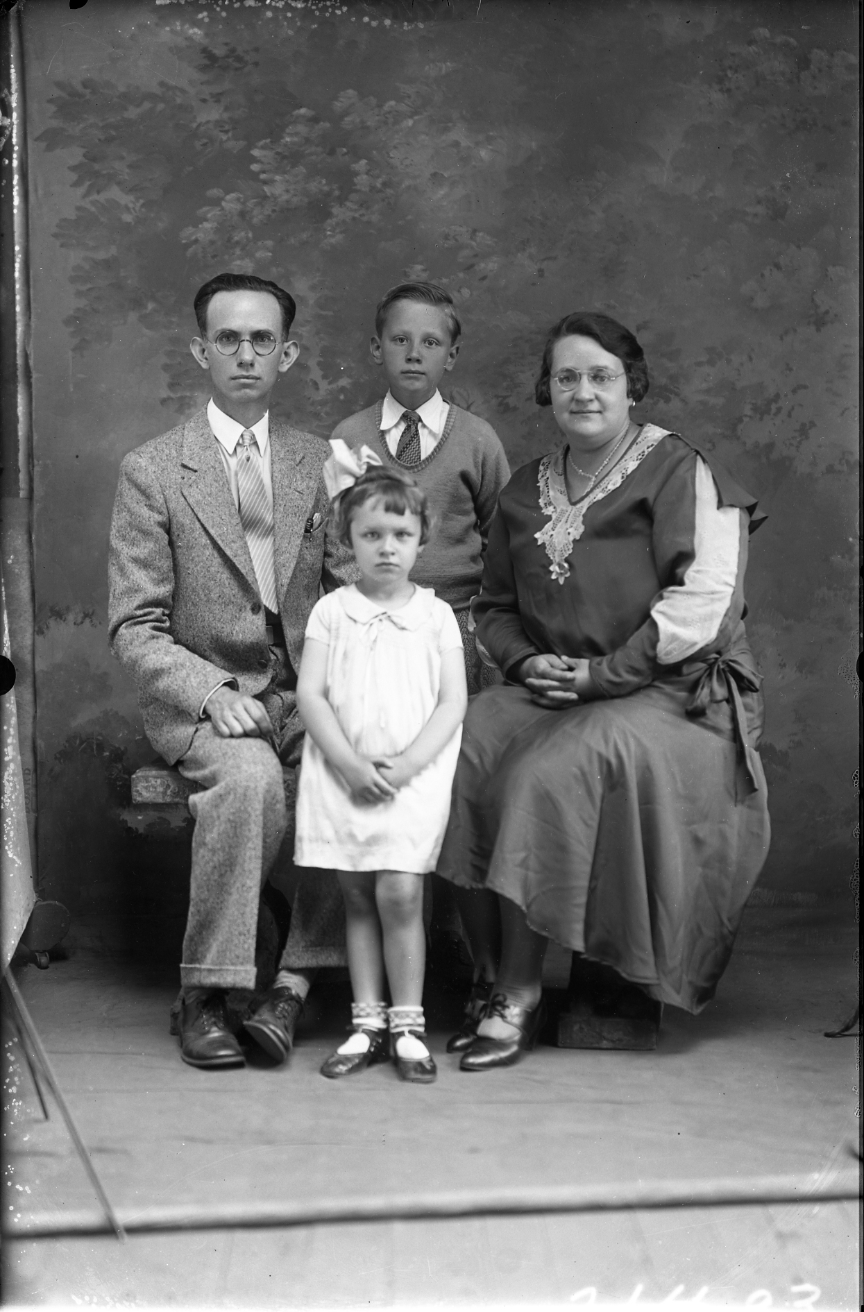 Unidentified man and woman, both with glasses and seated, are posed with two unidentified children, a girl and an older boy, standing between them.