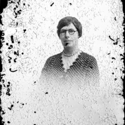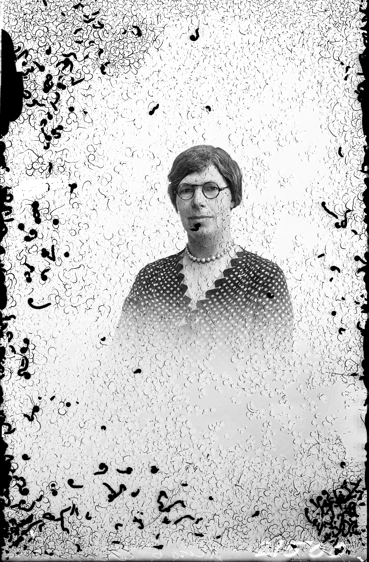 Portrait photograph of an unidentified woman wearing glasses and faux pearls with her print dress.