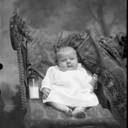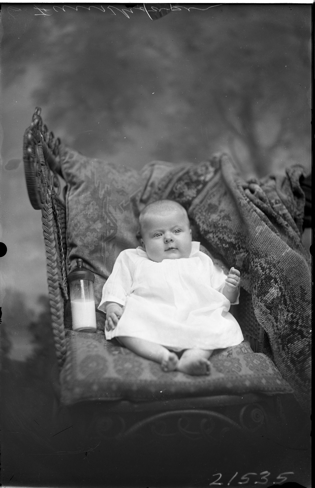 Unidentified barefoot baby is posed by a bottle and is propped against pillows on a wicker chair.