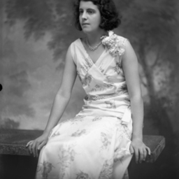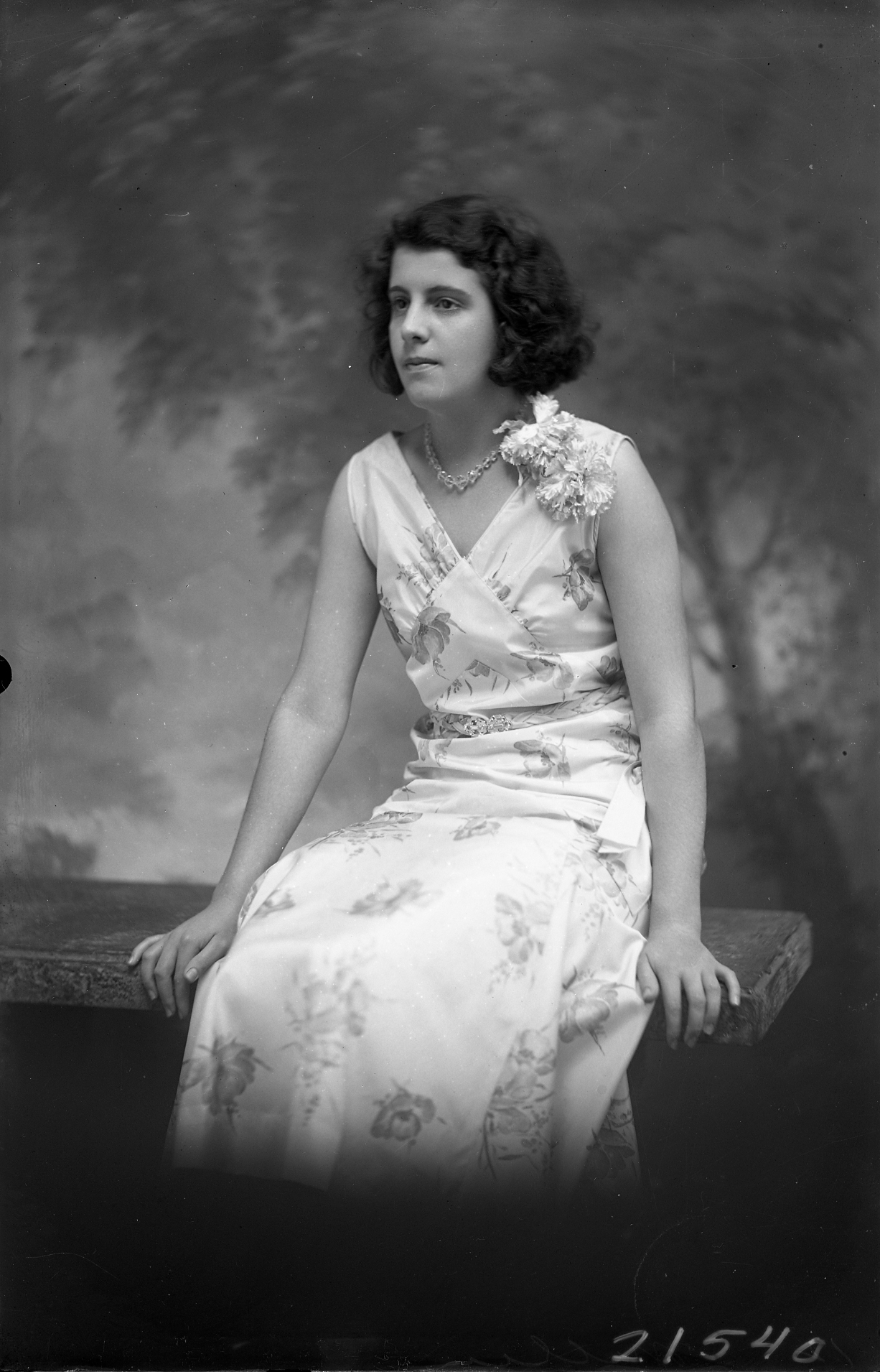 Unidentified young woman with short hair is seated on a bench and wearing a bead necklace and a corsage pinned to her sleeveless dress.