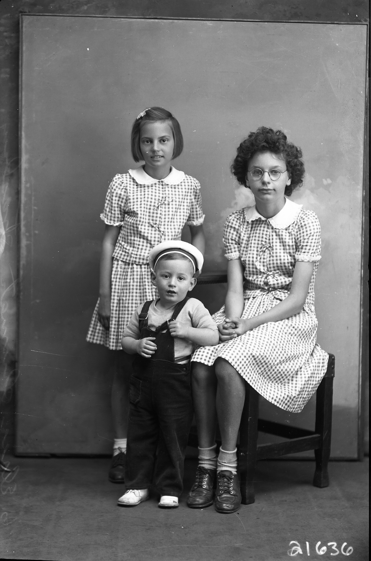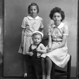 Three unidentified children, a young boy in a cap with two older girls, are posed together.