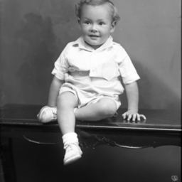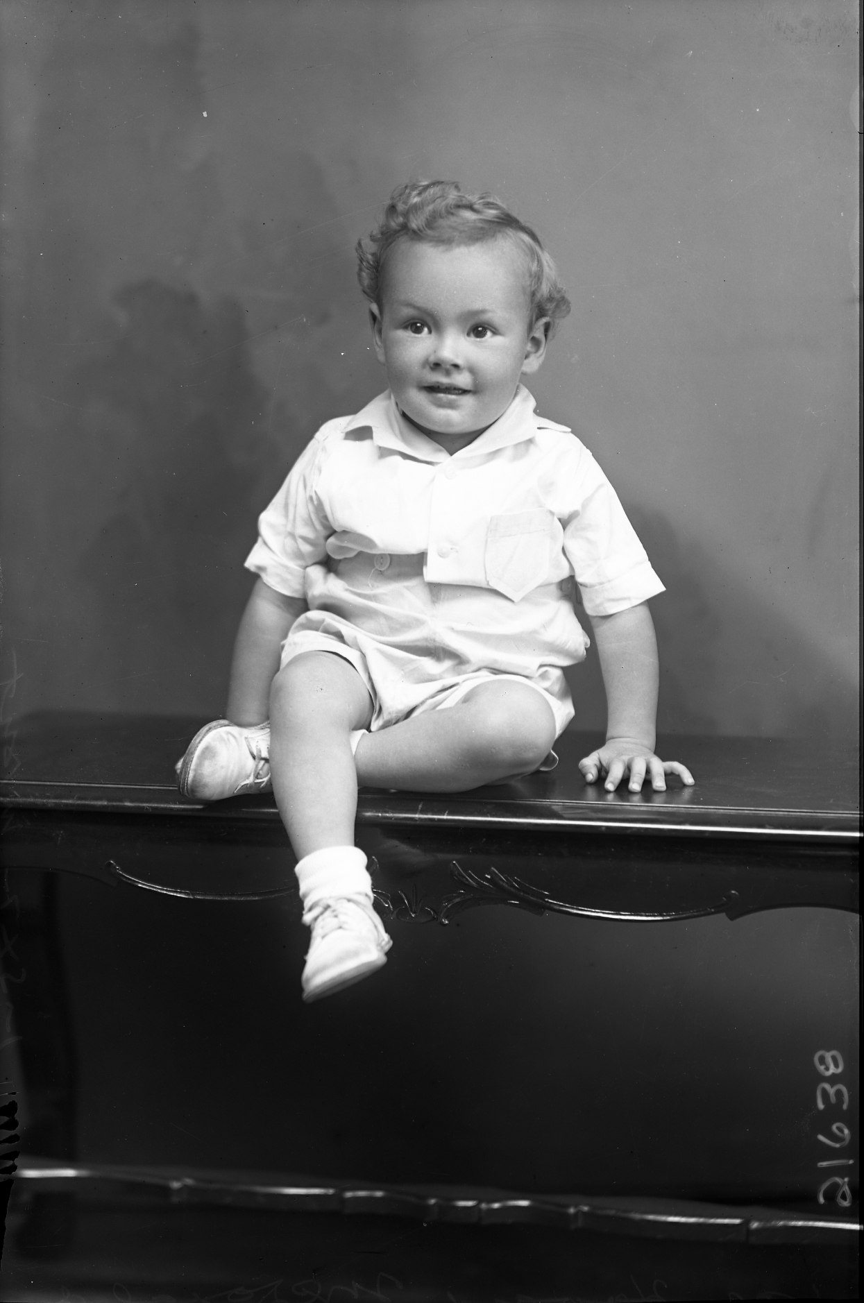 Unidentified young boy with curly hair is seated on a bench with one leg under the other.