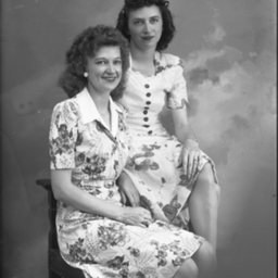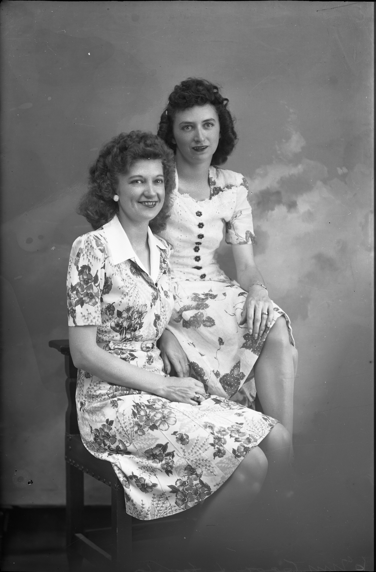 Two unidentified women, one seated on a chair and the other perched on its arm, are posed together.
