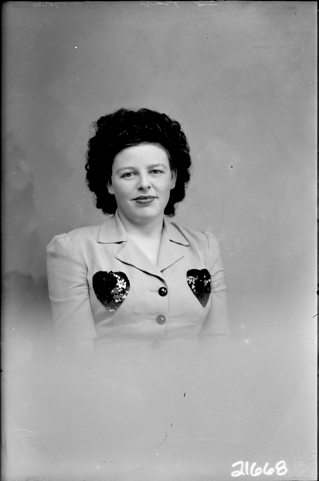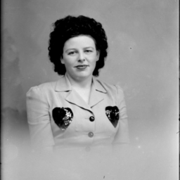 Portrait photograph of an unidentified woman with two heart patches on the front of her dress.