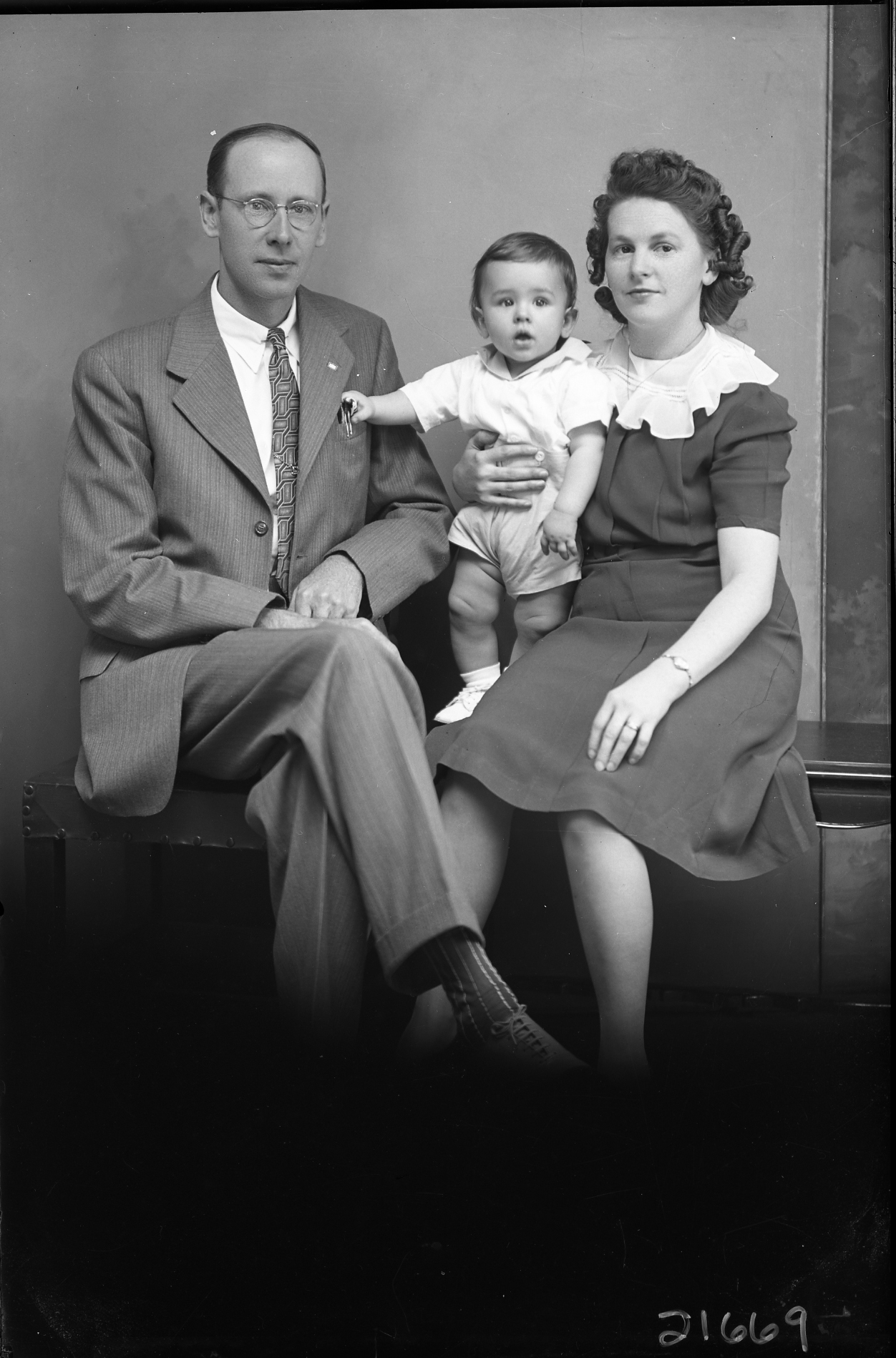 Unidentified man with glasses is seated beside an unidentified woman and young child.