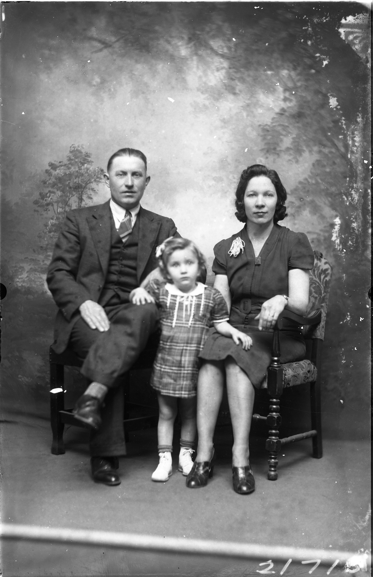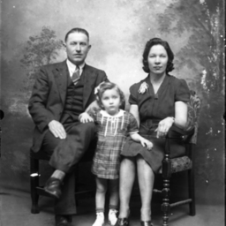 Unidentified man and woman, seated together, with an unidentified little girl in a plaid dress standing between them.