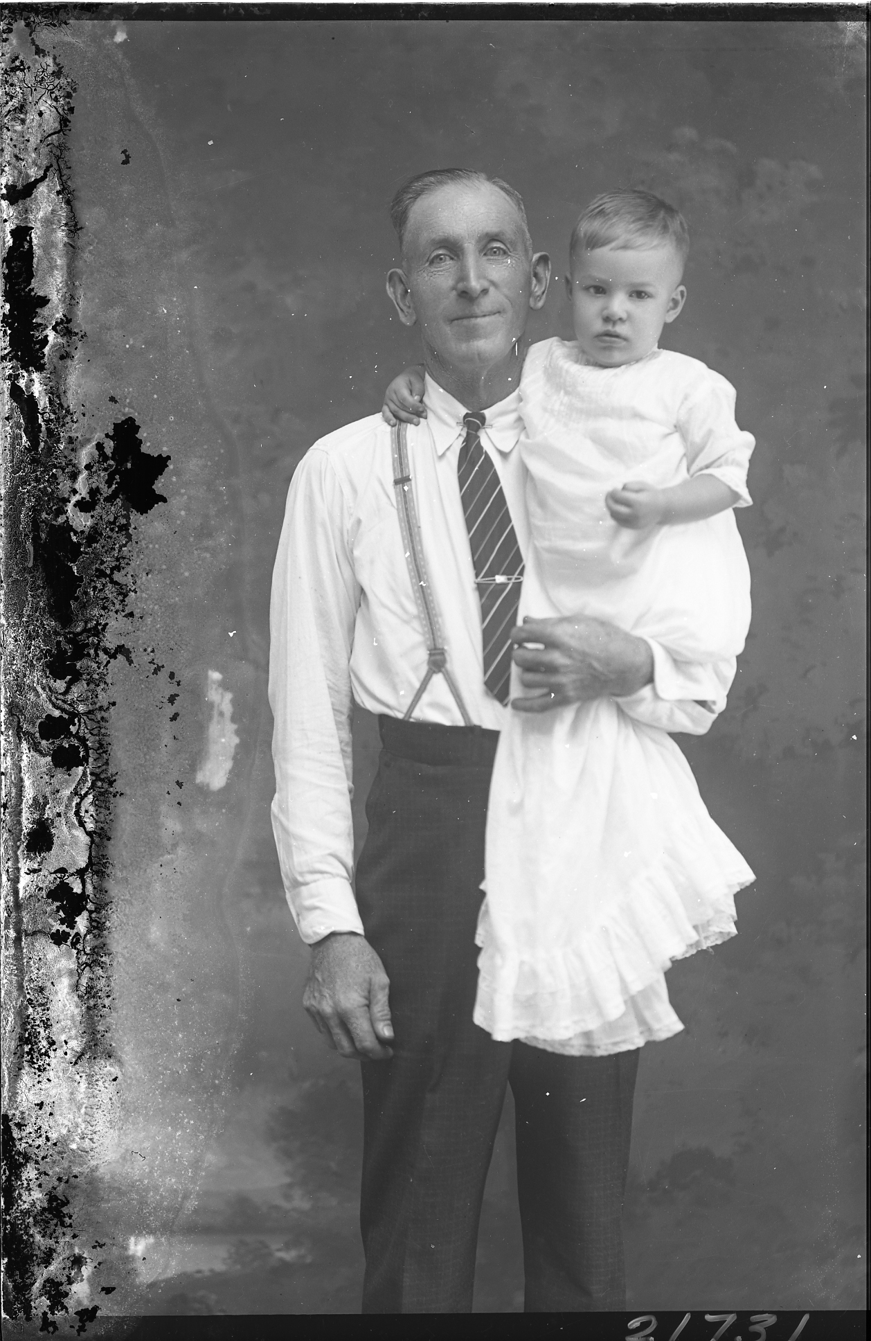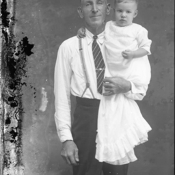 Unidentified older man wearing suspenders and a tie is holding an unidentified young boy.