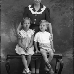 Unidentified woman is standing behind two unidentified young children, a girl and a younger boy, both seated on a bench.