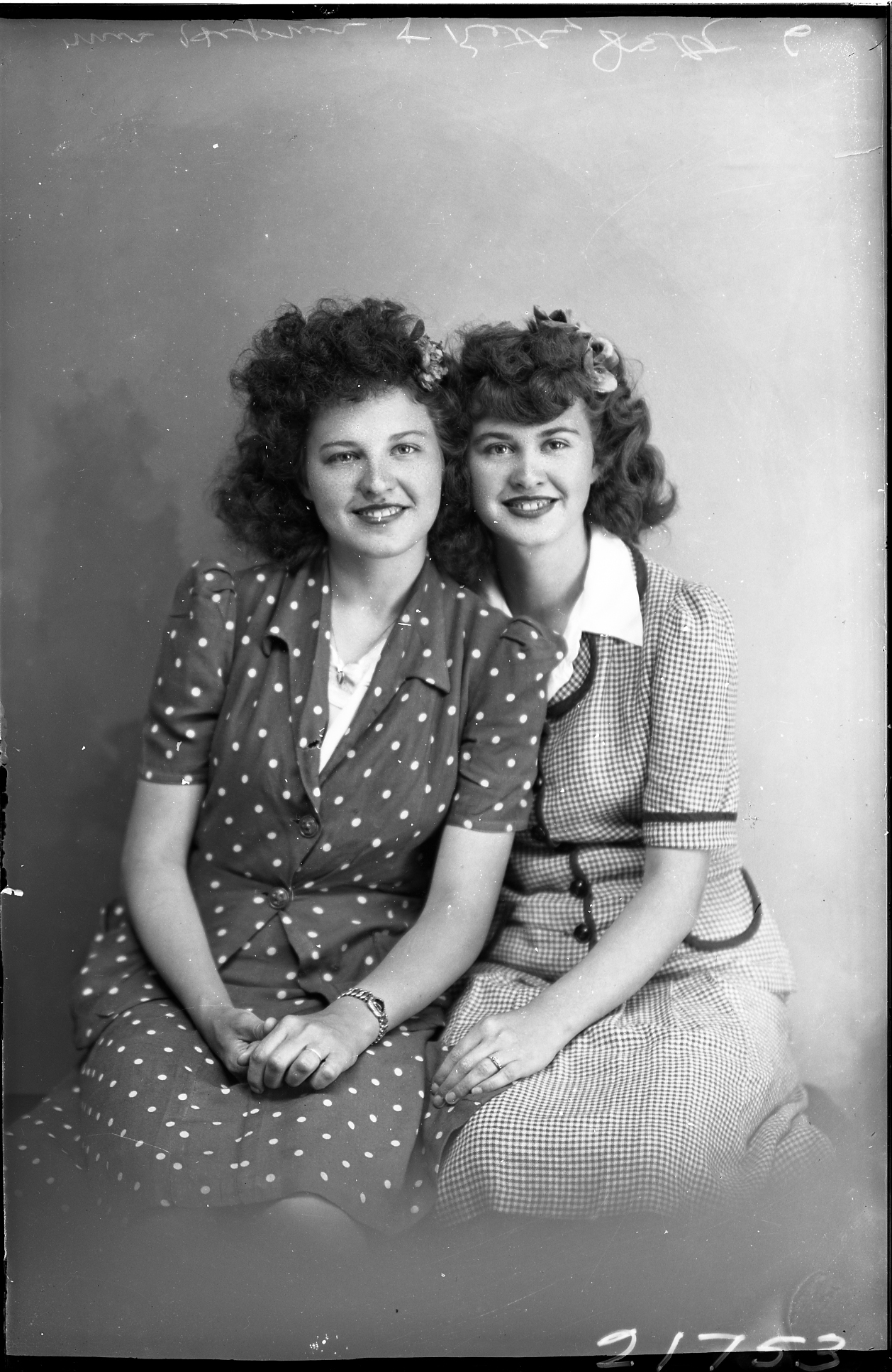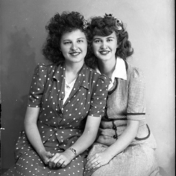 Two unidentified women posed together. Both have similar hair styles. One is wearing a dress with polka dots. The other is wearing a checkered dress.