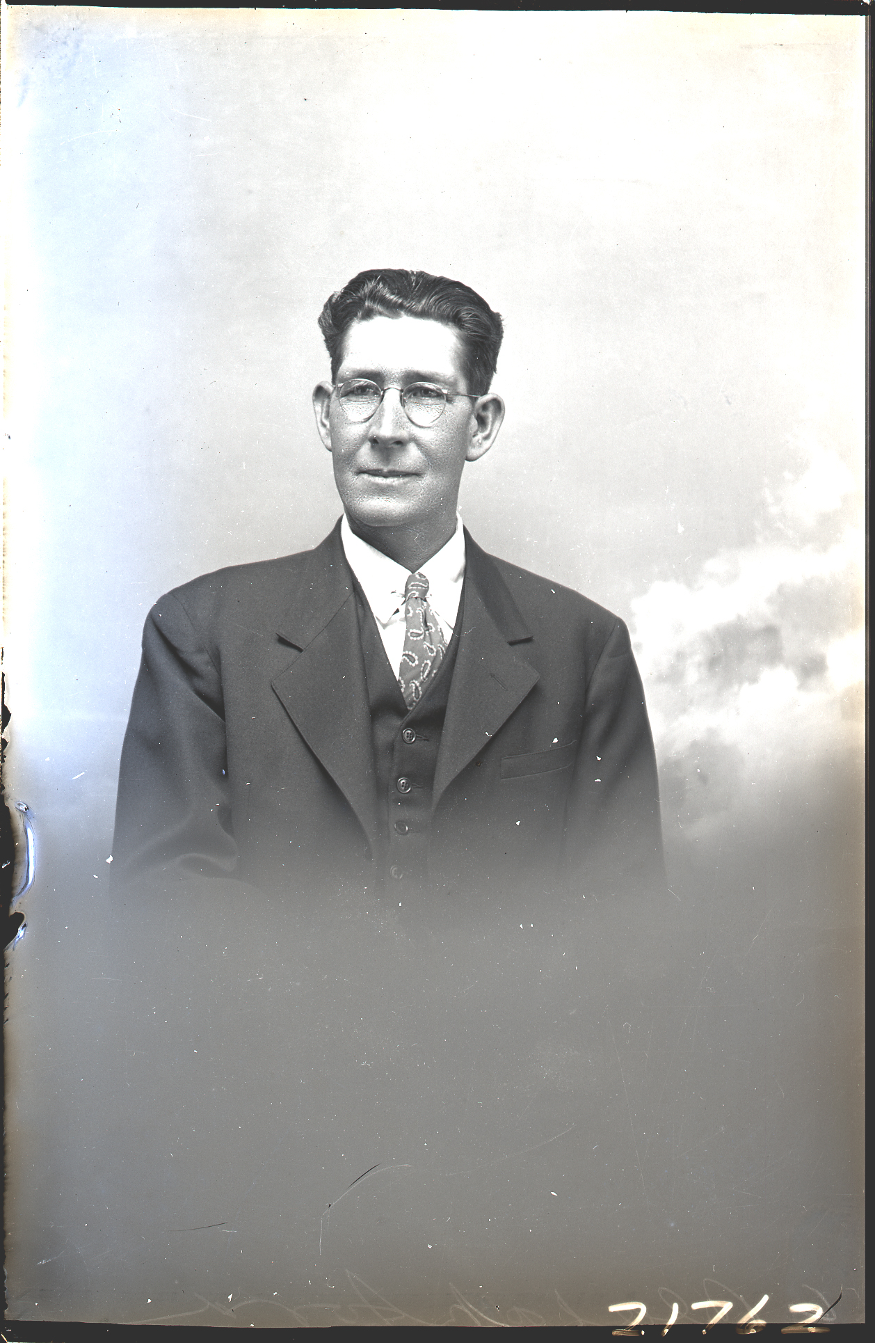 Portrait photograph of an unidentified man with glasses and wearing a suit and tie.