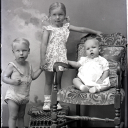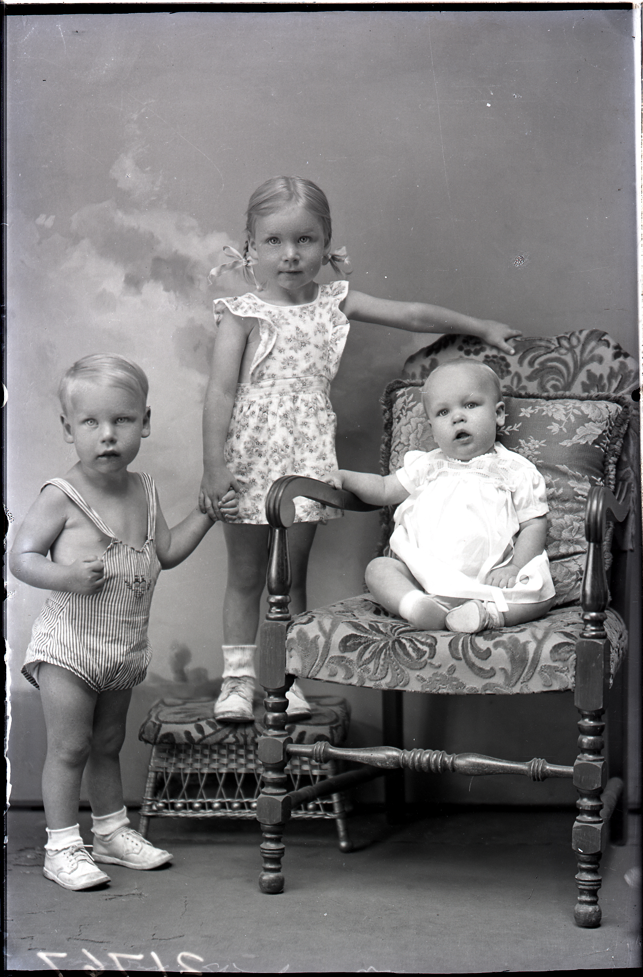 Three unidentified children of different ages are posed together. There is a baby on a chair, with an older boy and girl standing beside it.