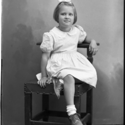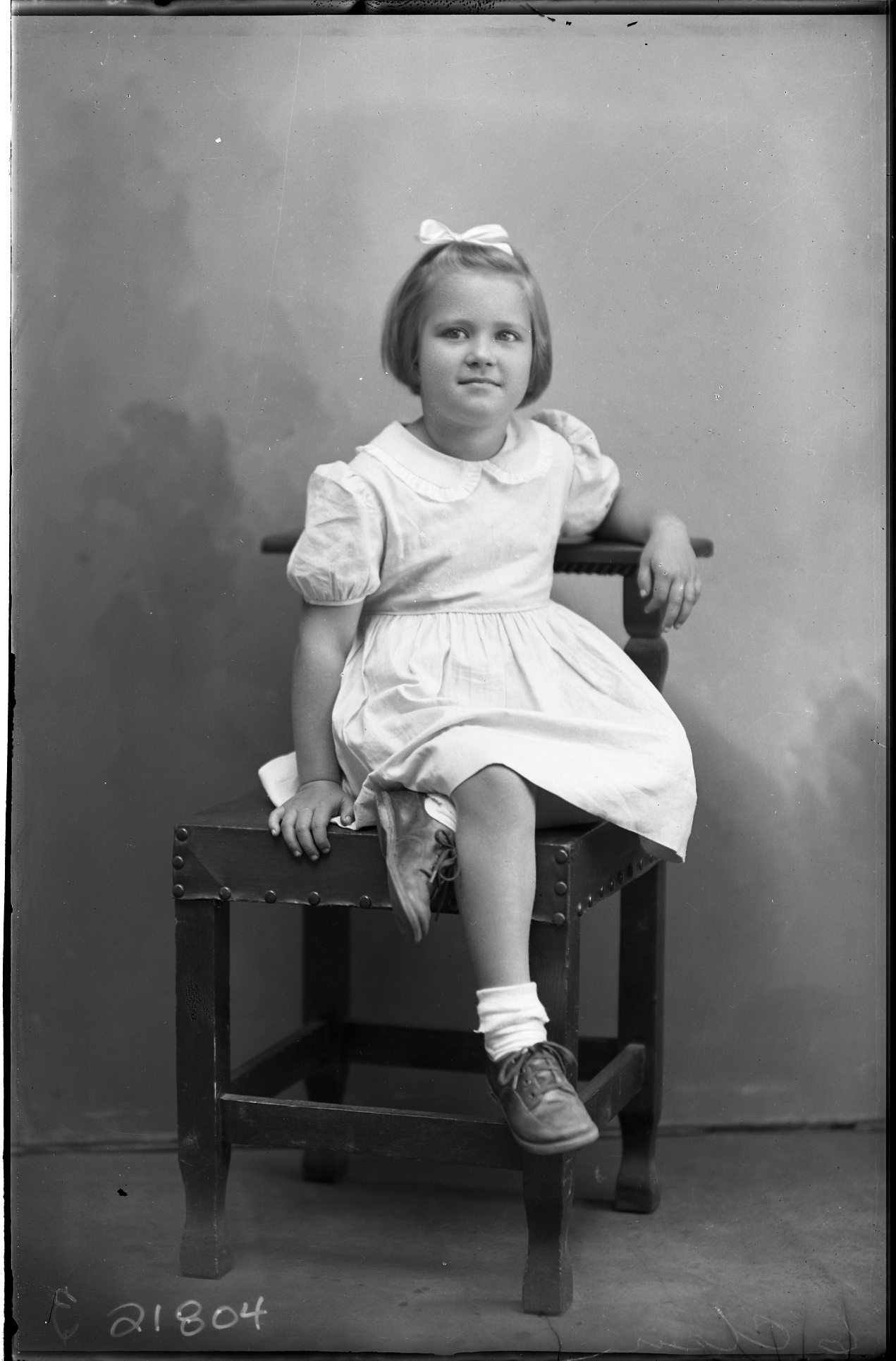 Unidentified girl with a bow in her short hair is seated on a chair with one leg under the other.
