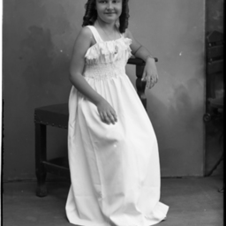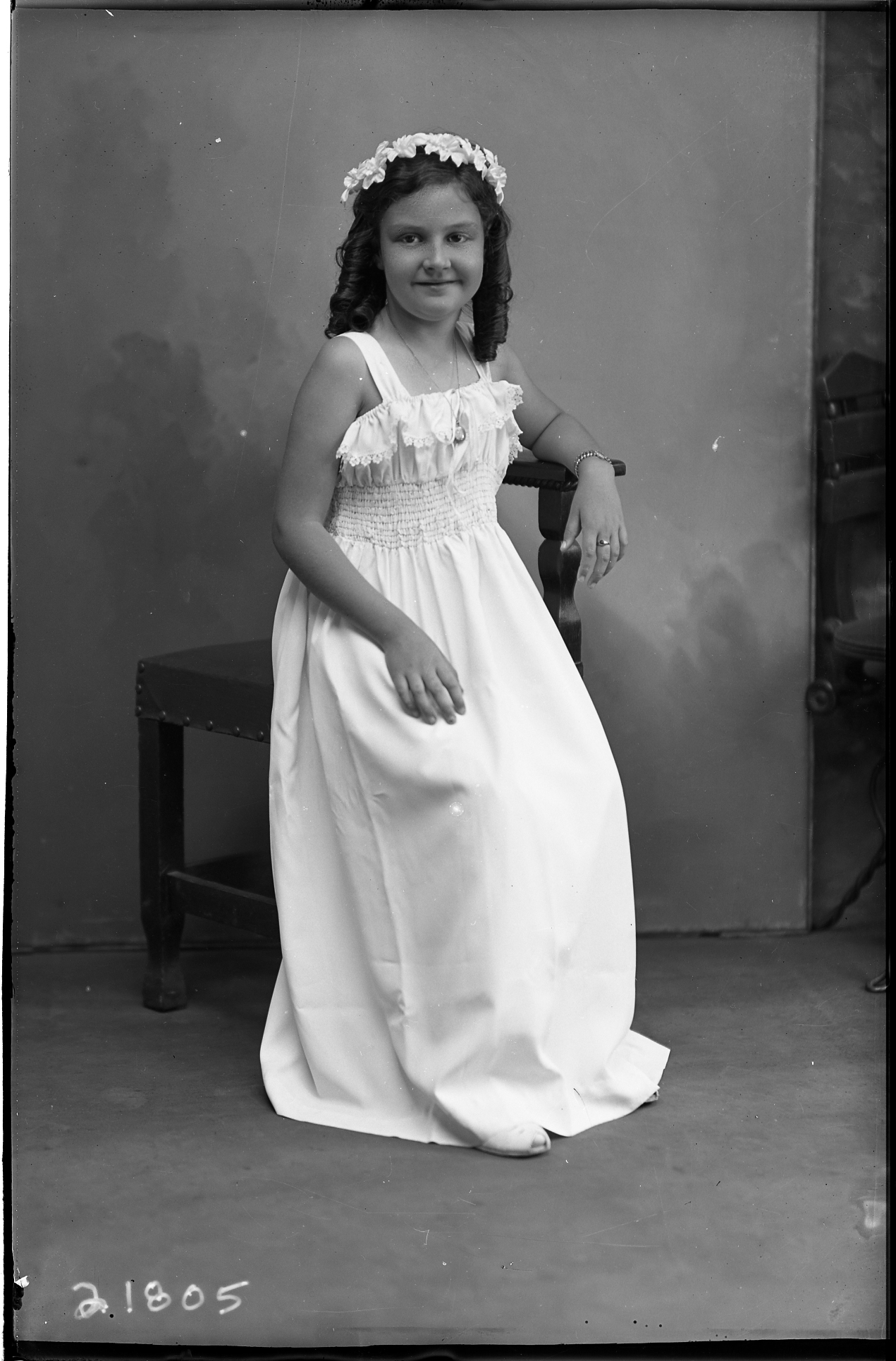 Unidentified girl has a decorative garland in her hair and is posed on a chair in a long white dress.