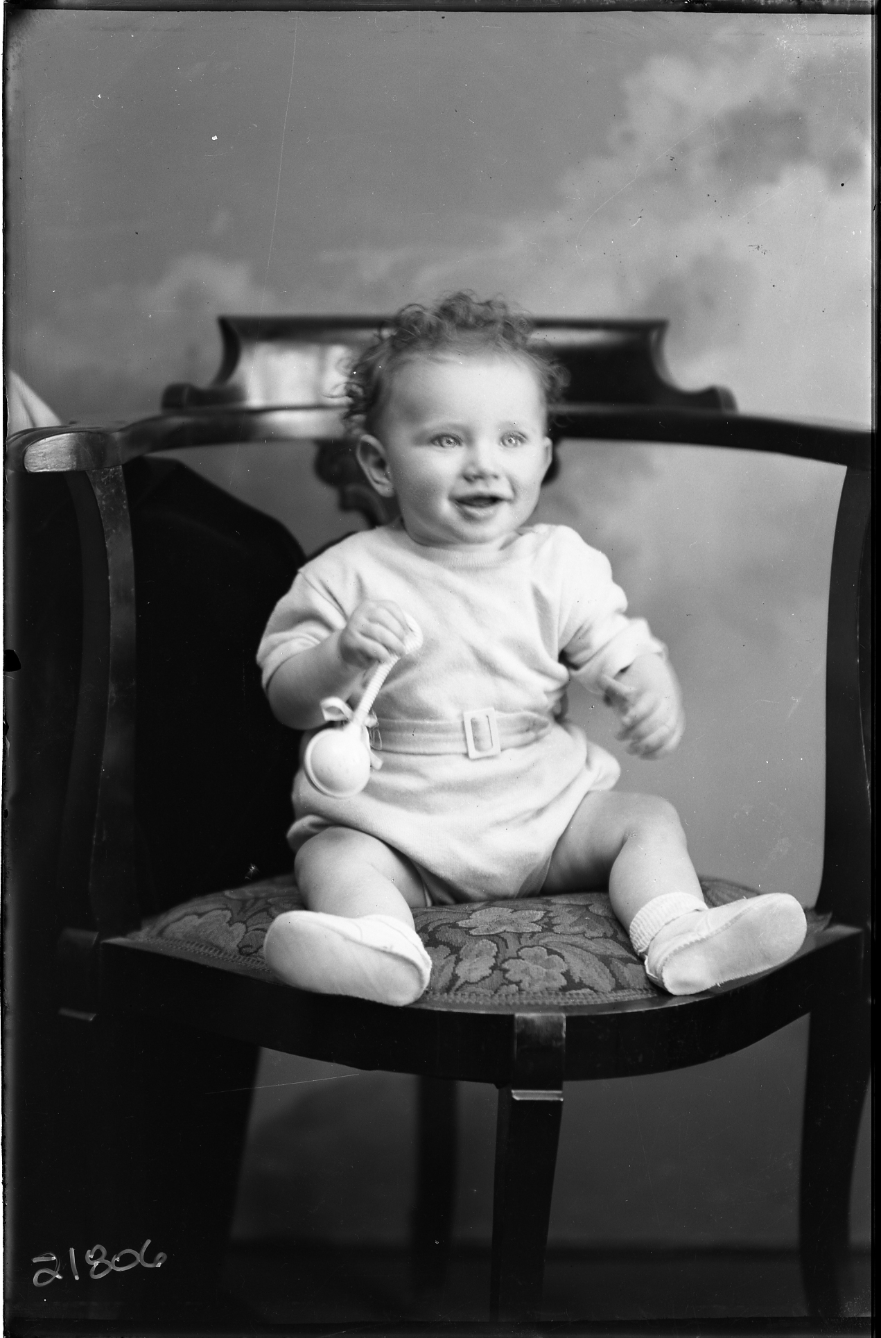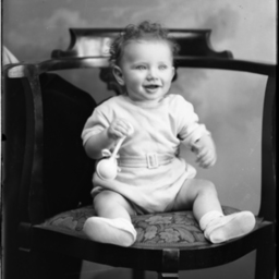 Unidentified toddler seated on a chair and holding a rattle toy.