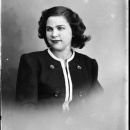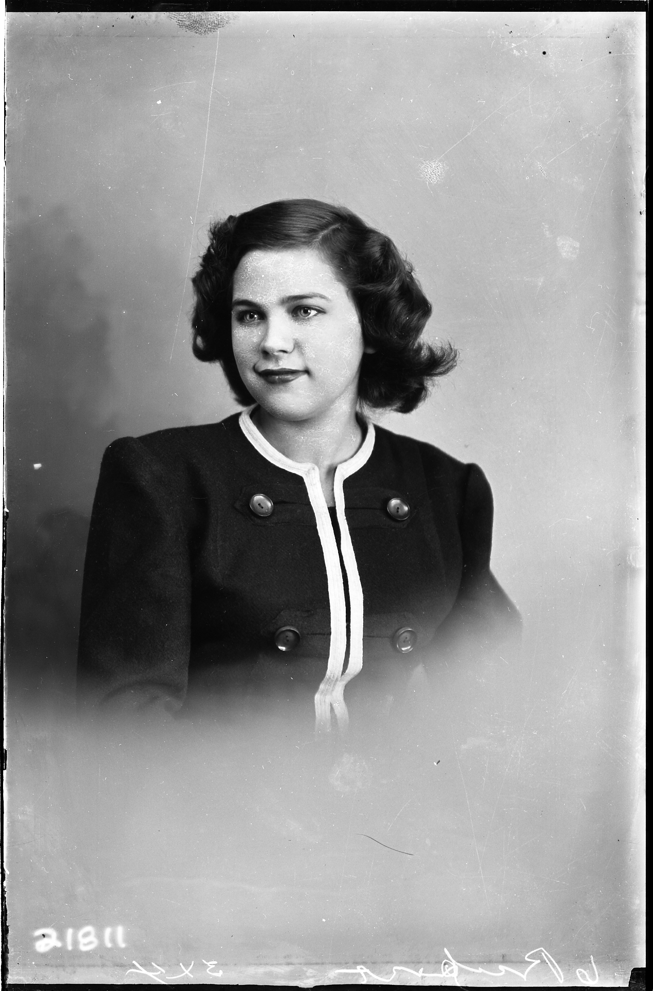 Portrait photograph of an unidentified woman with short hair, wearing a dark dress with white piping around the collar and down the front..