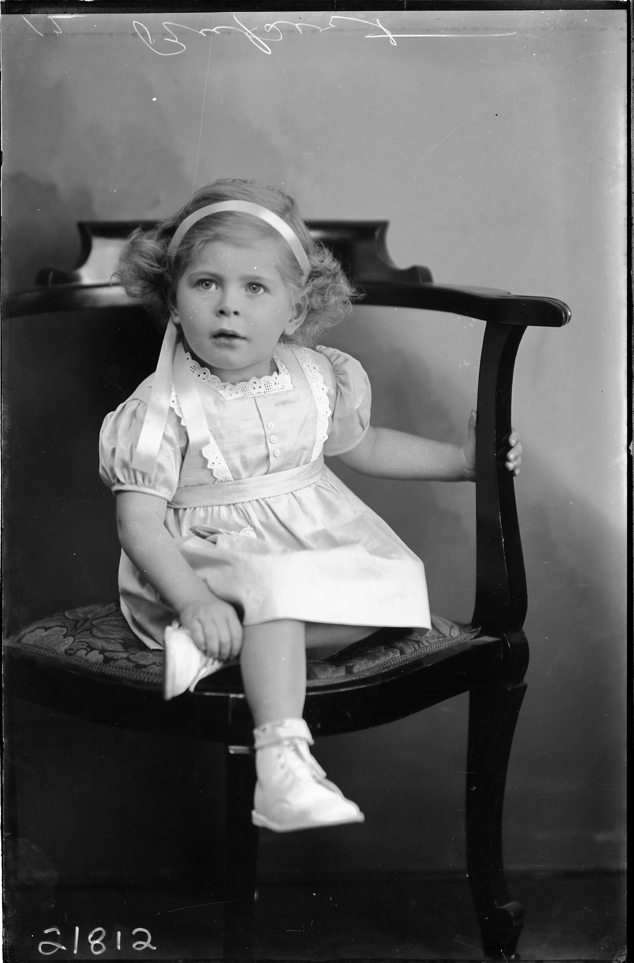 Unidentified young girl wearing a ribbon in her hair is seated with one leg under the other.