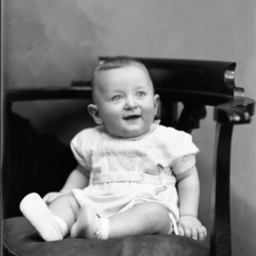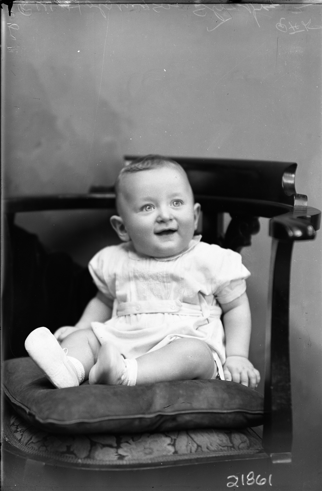 Unidentified toddler is smiling and seated on a pillow on a chair.