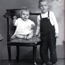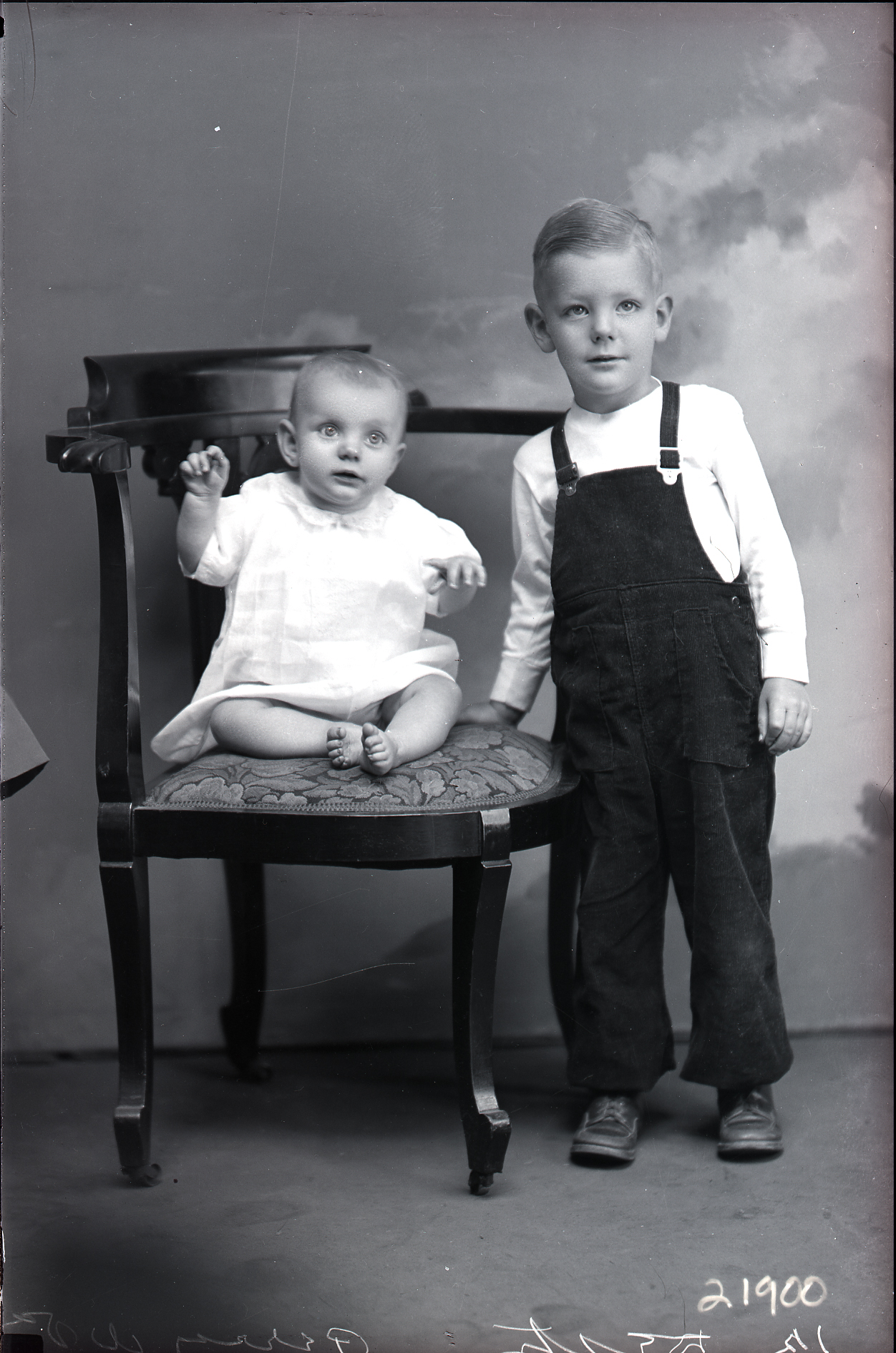 Two unidentified young children, a barefoot baby and an older boy in overalls, are posed together with a chair.