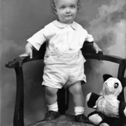 Unidentified curly-haired child is standing on a chair with a stuffed bear.