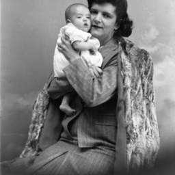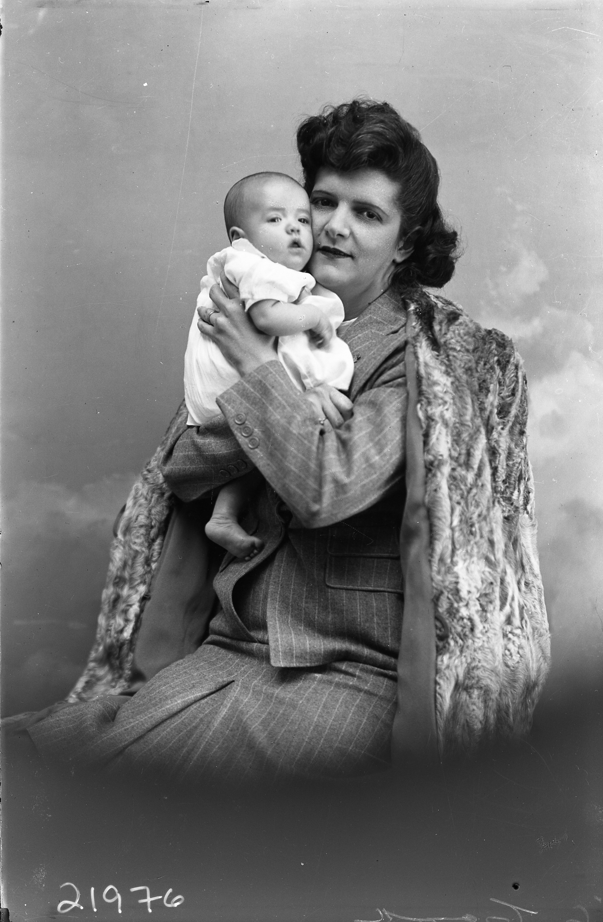 Unidentified woman is holding an unidentified baby up to her cheek. She has a fur coat draped over her shoulders.