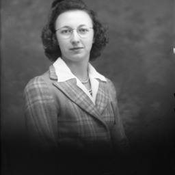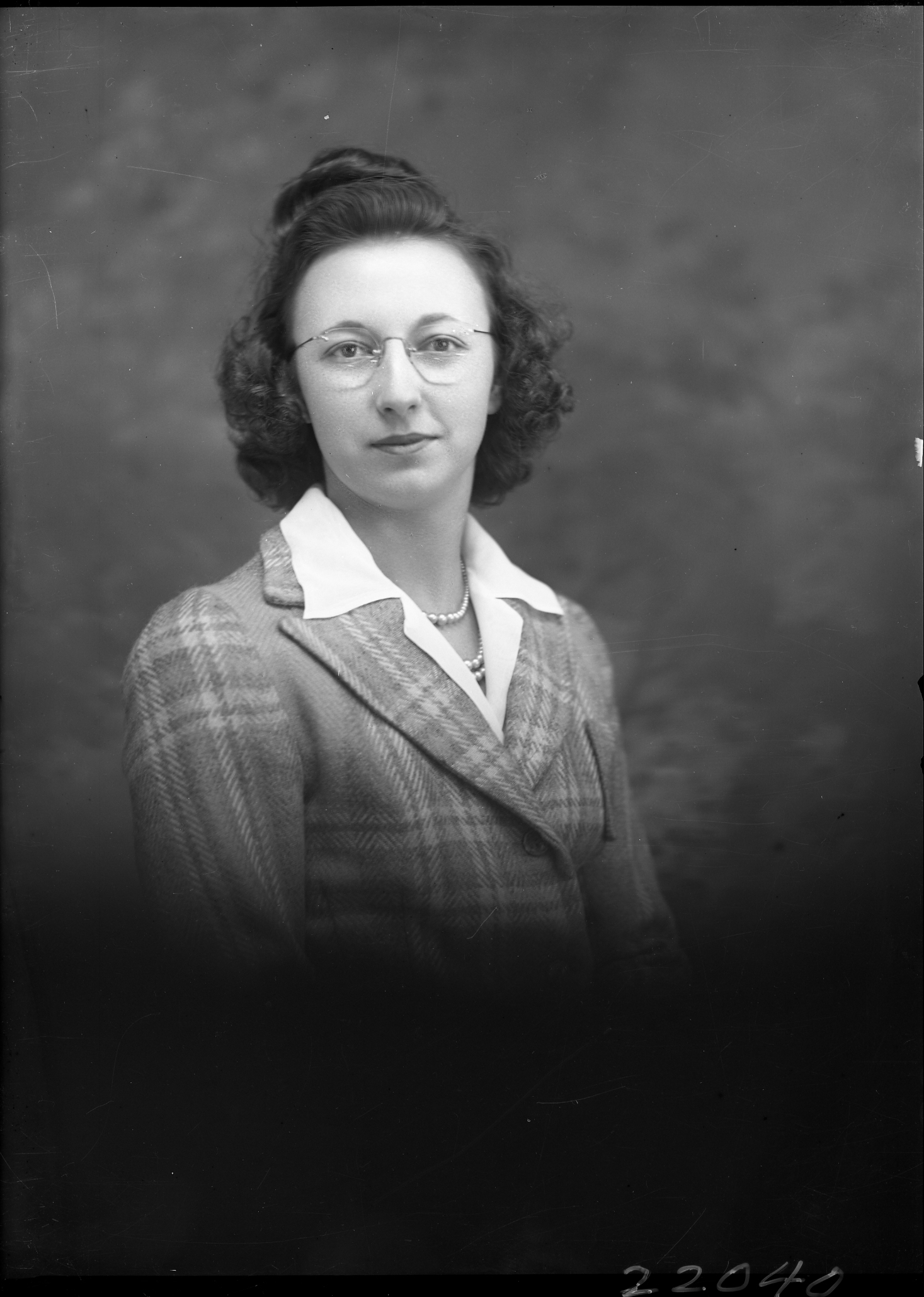 Portrait photograph of an unidentified woman with glasses wearing a faux pearl necklace and a plaid jacket.