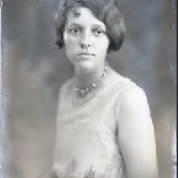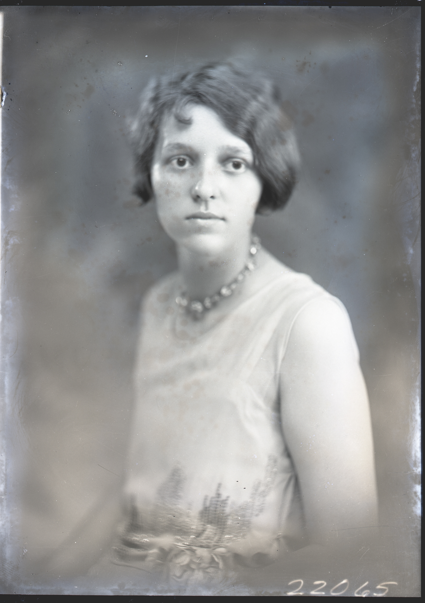 Portrait photograph of an unidentified young woman with her hair pulled back and a single curl visible on her forehead.