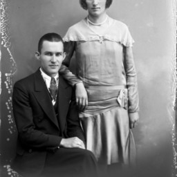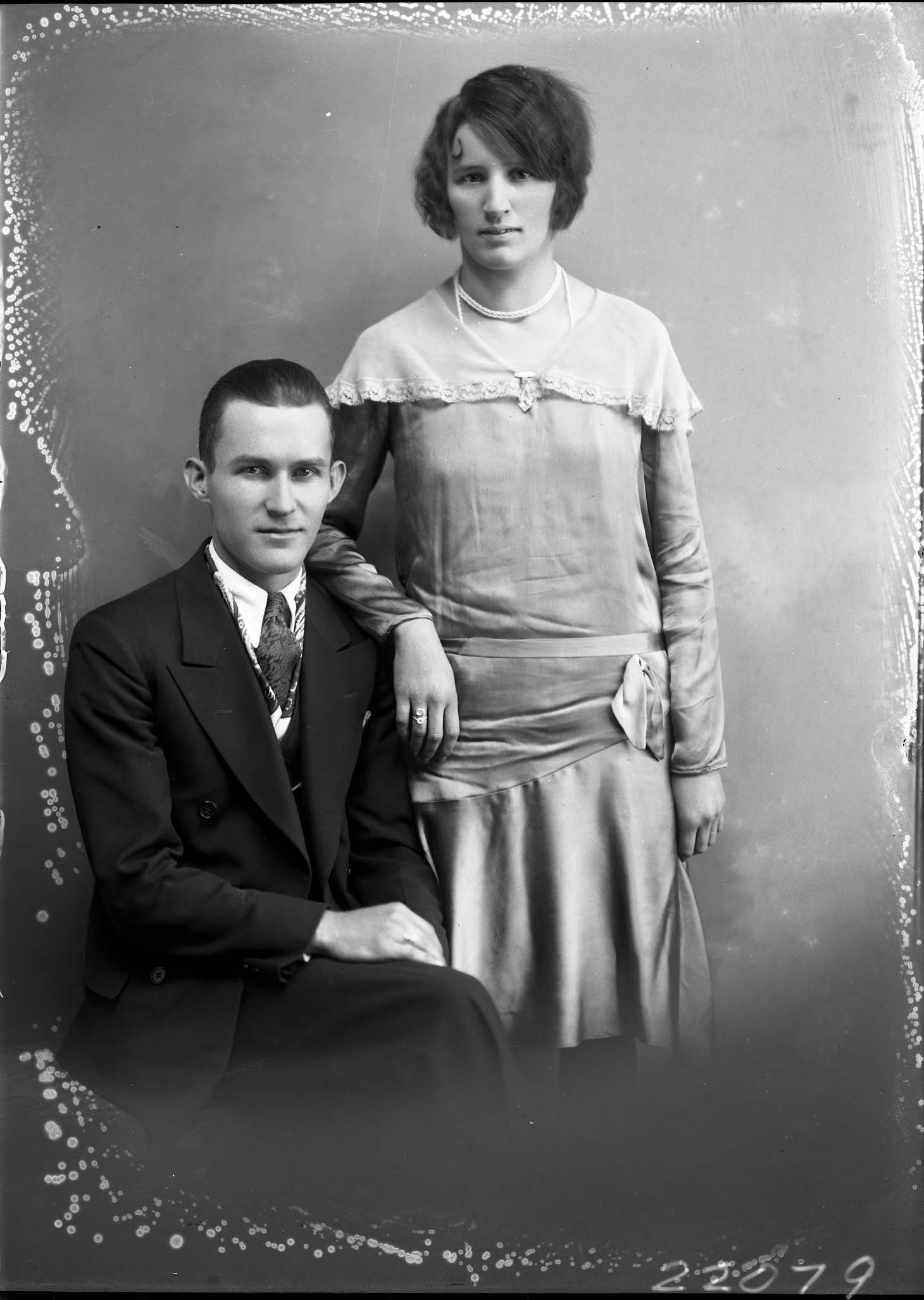 Unidentified man, seated, with an unidentified woman standing beside him. She had her arm resting on his shoulder.