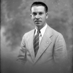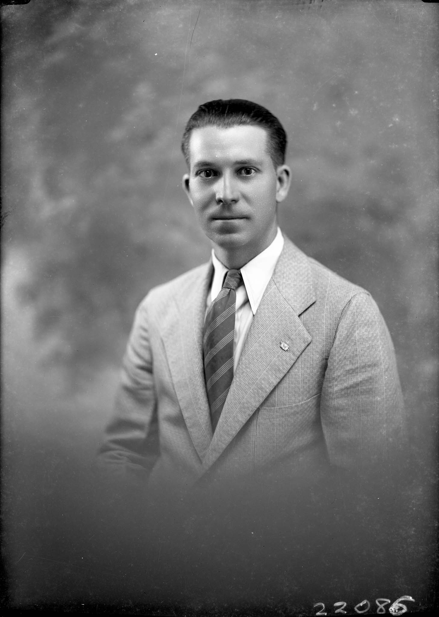Portrait photograph of an unidentified man wearing a suit and striped tie with a pin on his lapel.