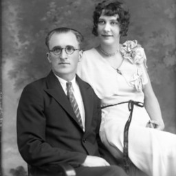 Unidentified man with glasses is seated, with an unidentified woman perched on the chair's arm beside him. She is wearing a corsage on her dress.