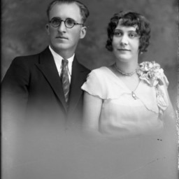 Portrait photograph of an unidentified man with glasses and woman wearing a corsage on her dress.