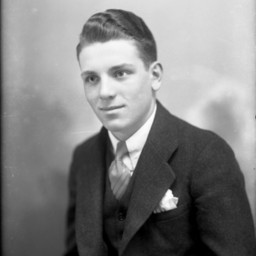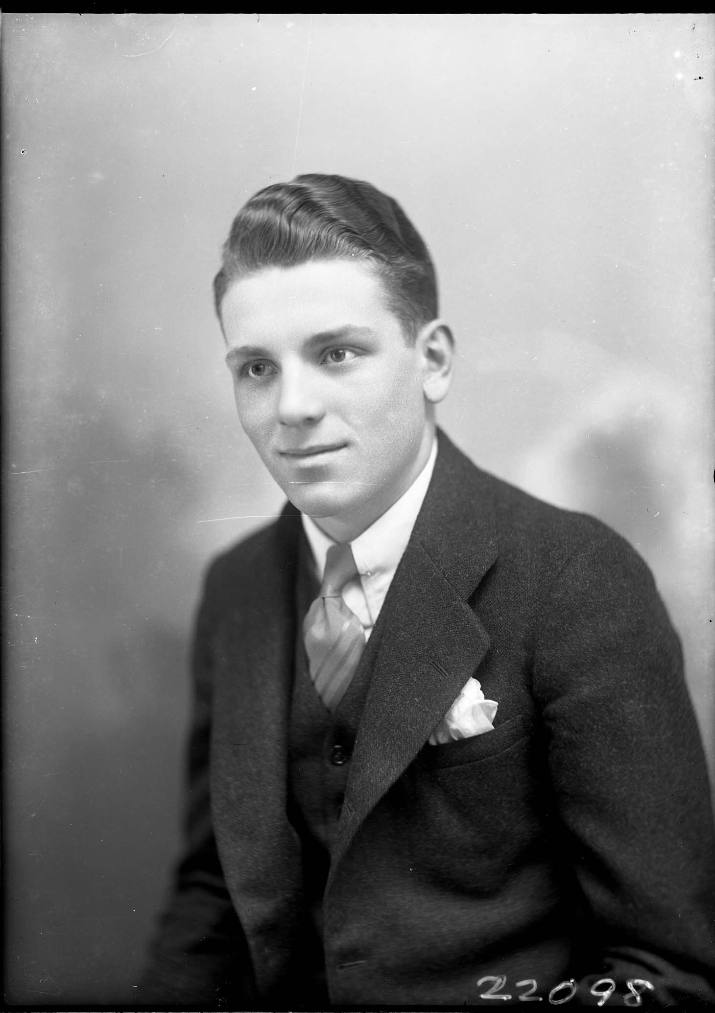 Portrait photograph of an unidentified young man wearing a suit and tie with a handkerchief sticking out of his breast pocket.