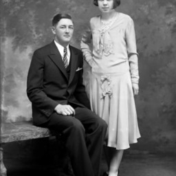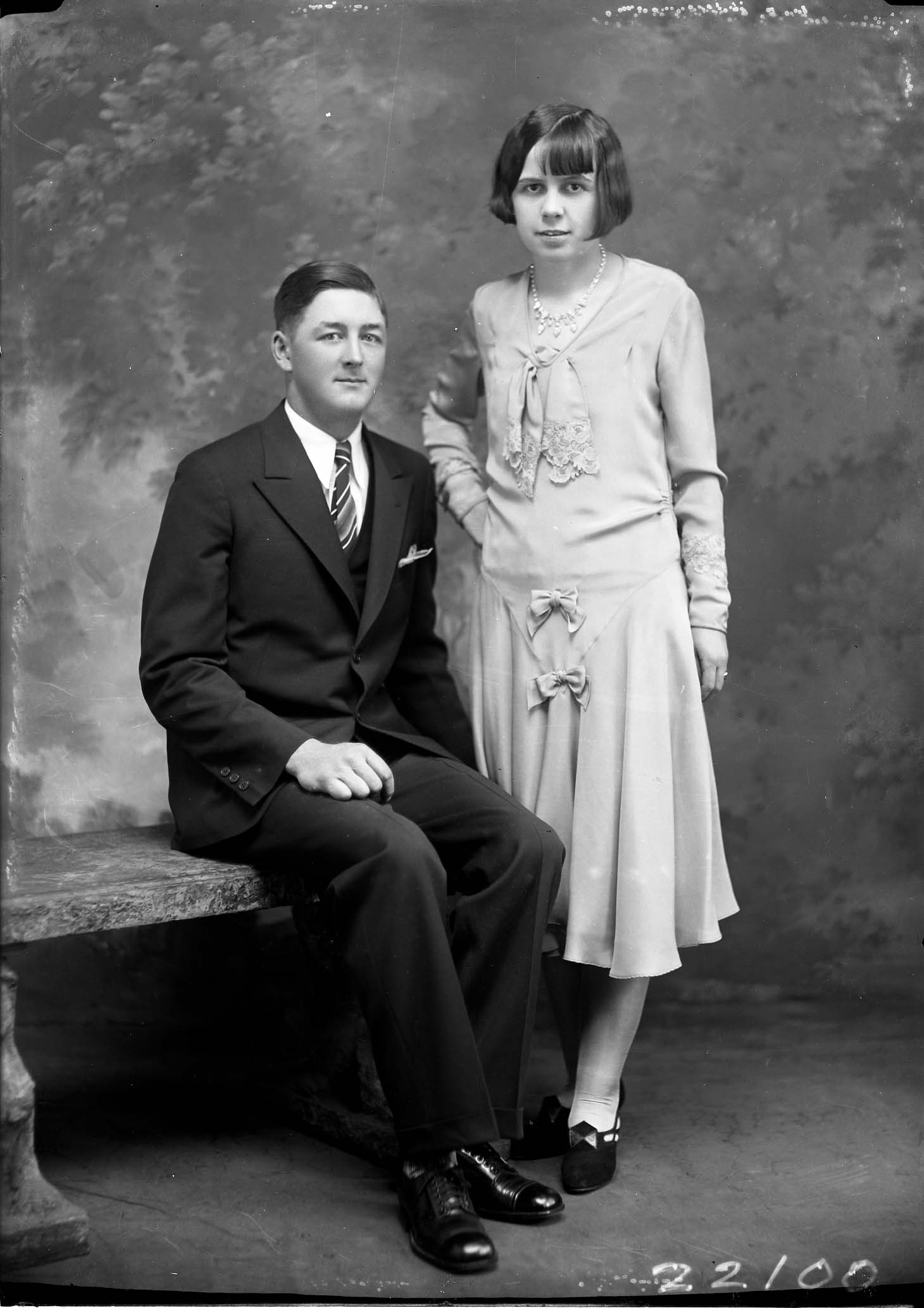 Unidentified young man in a suit is seated beside a young woman with short hair who is standing with one hand on her hip.