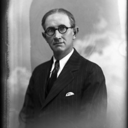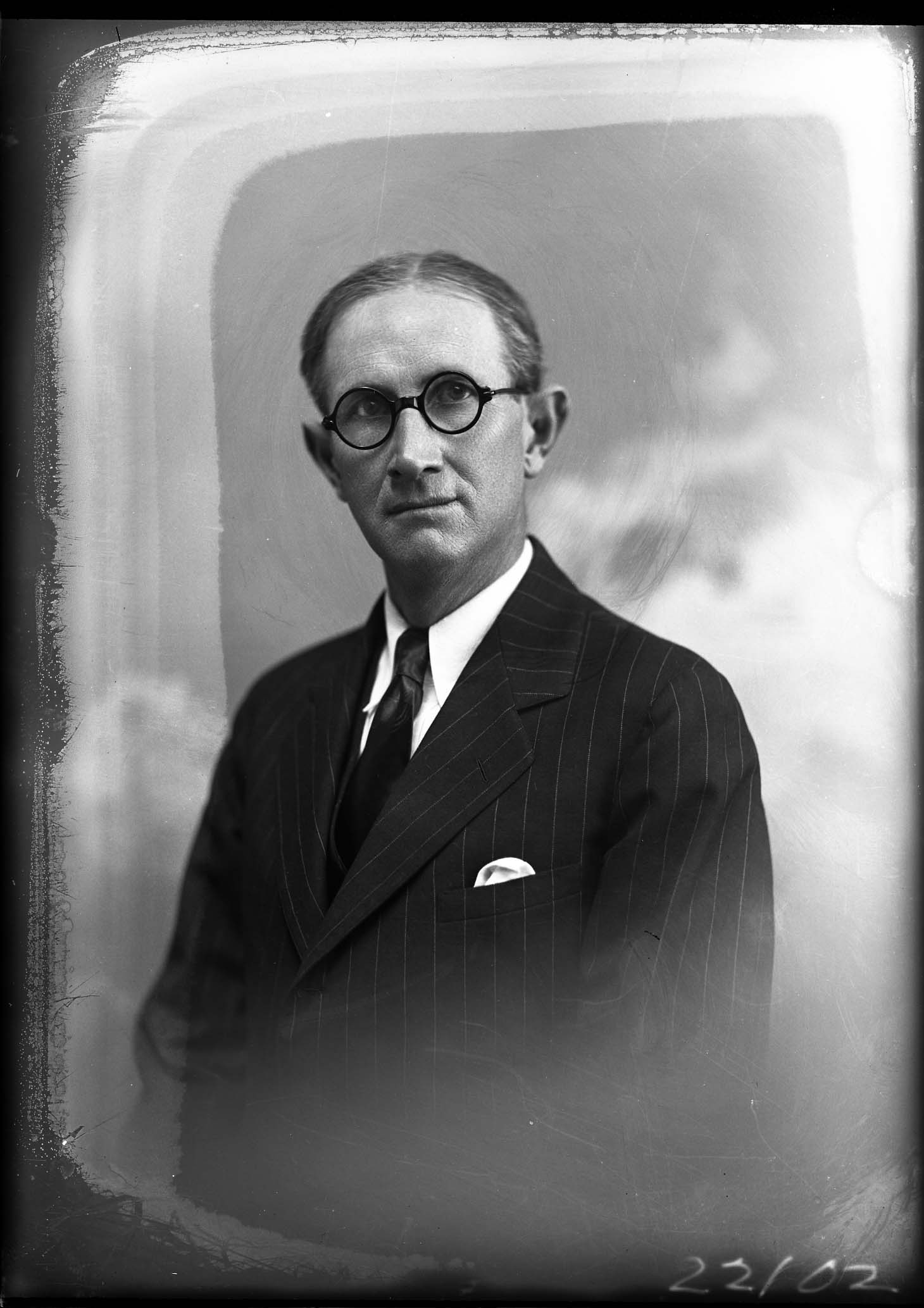 Portrait photograph of an unidentified man with round glasses and wearing a suit and tie with a handkerchief visible sticking out of his breast pocket.
