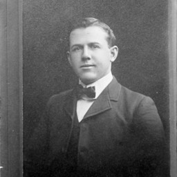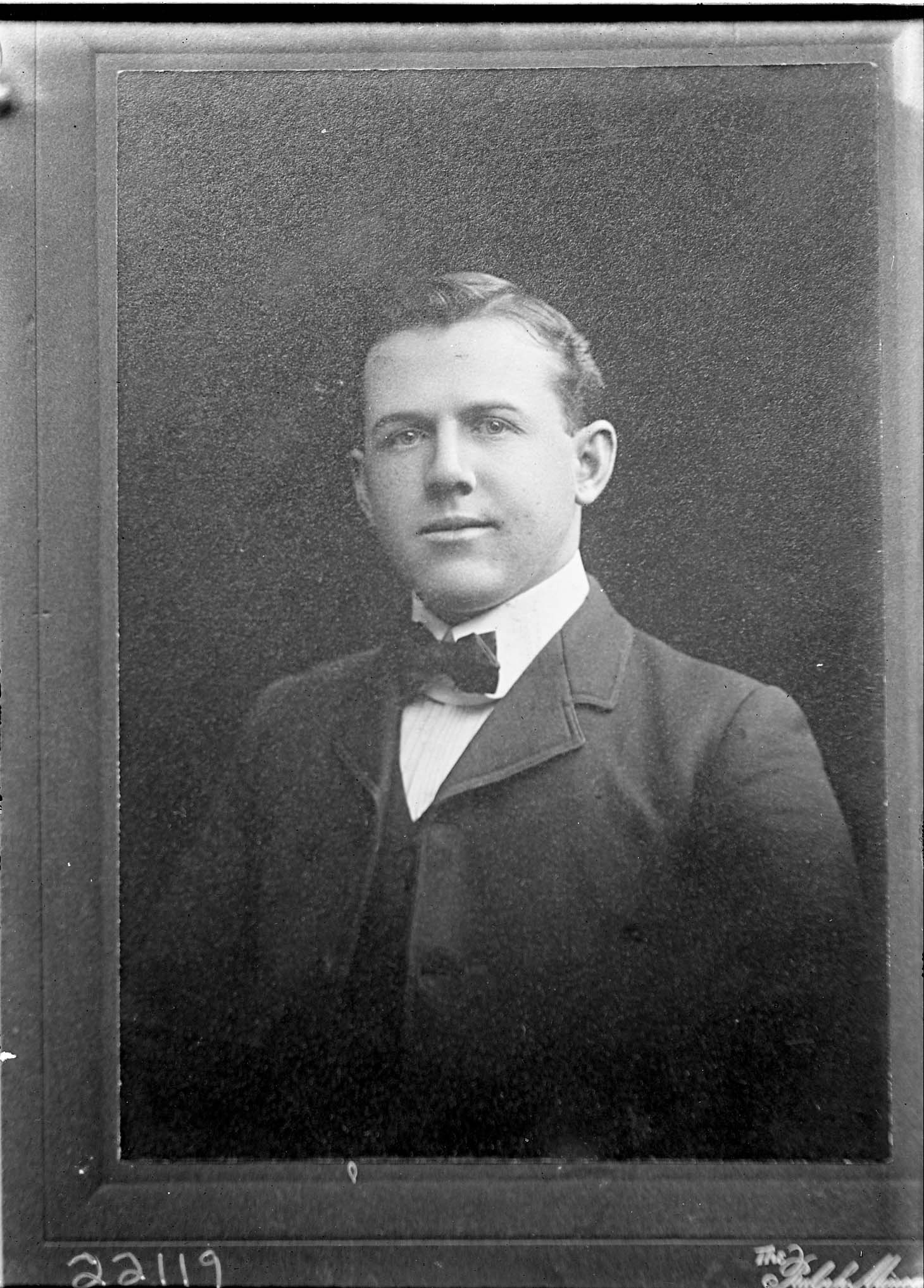 Photo of a framed photograph of an unidentified man wearing a suit and bow tie with a starched collar.