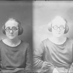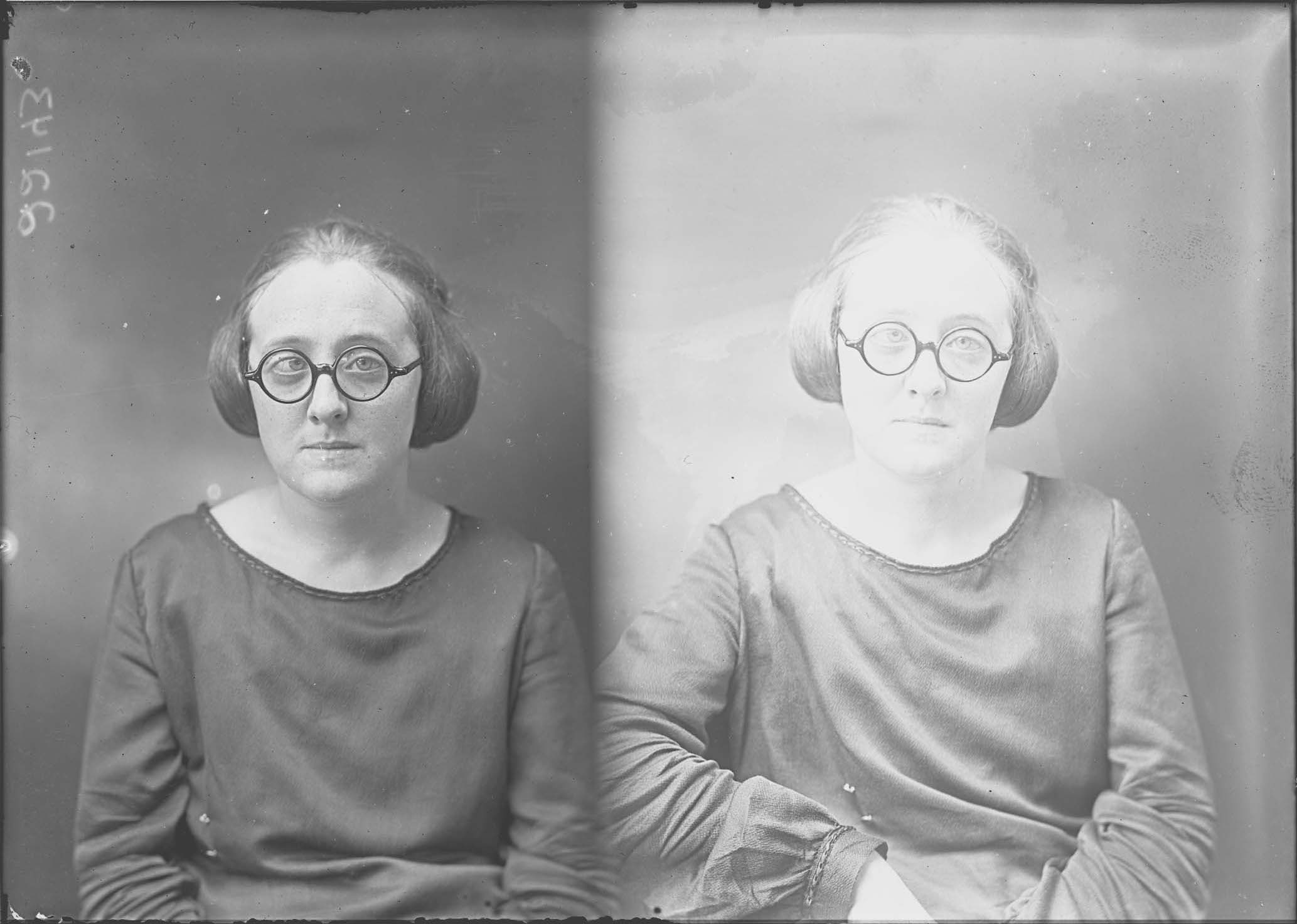 Photo of two portrait photographs of the same unidentified woman with round glasses.