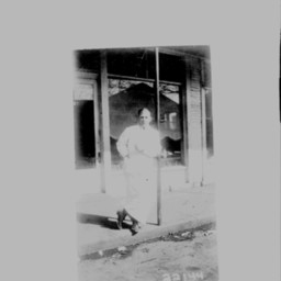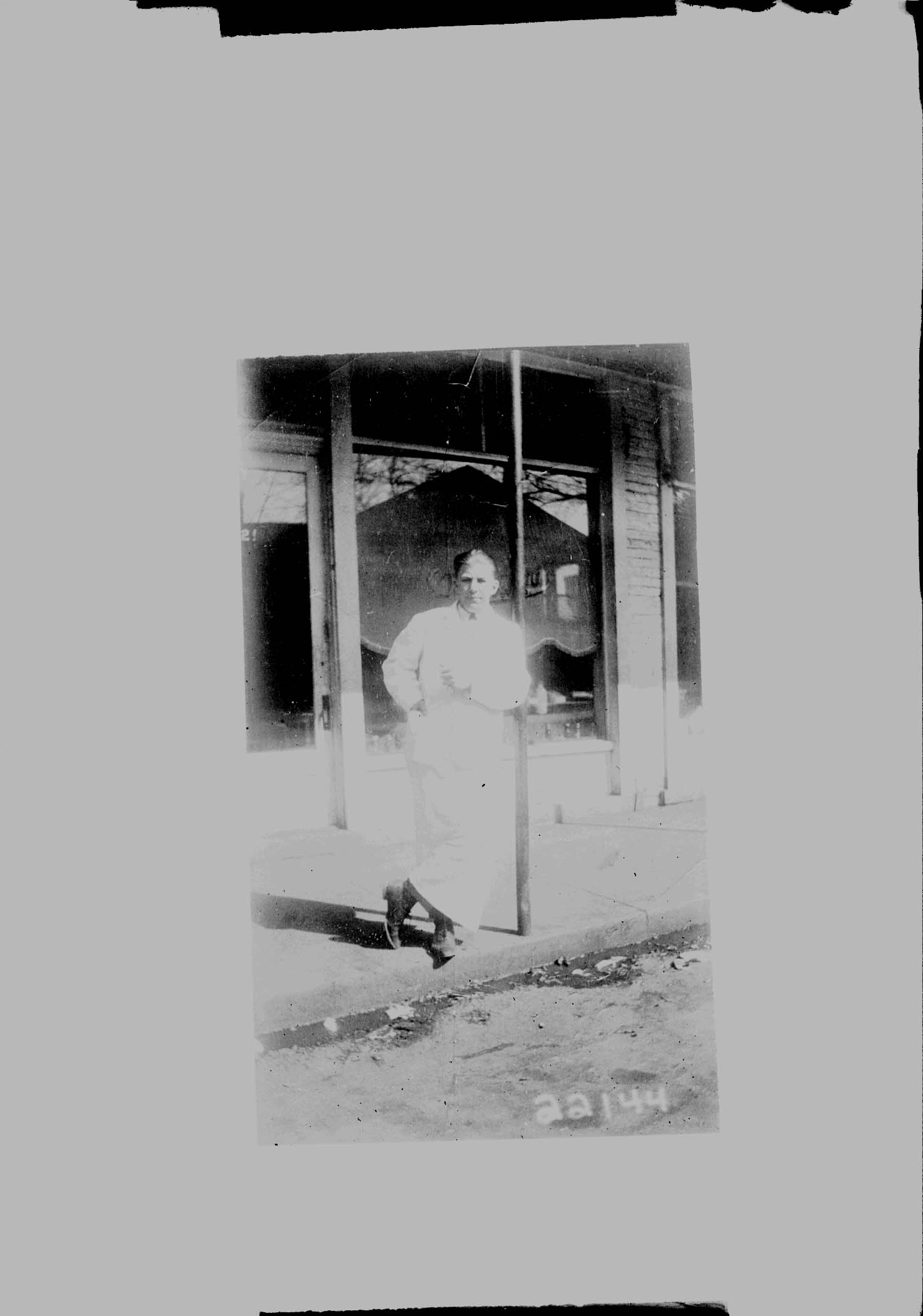 Photo of an earlier photograph of an unidentified man standing outside a store or business and leaning against a post.