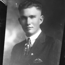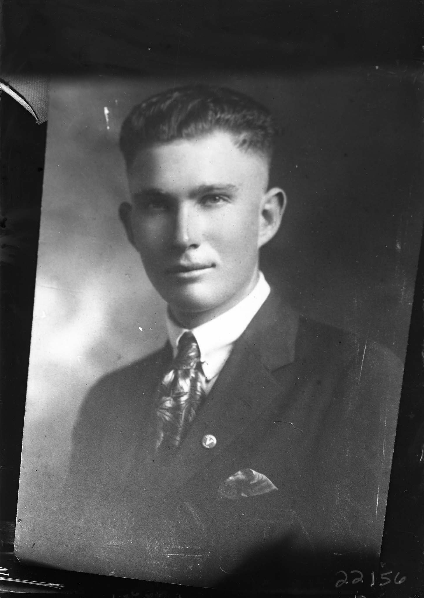 Photo of a portrait photograph of an unidentified young man wearing a suit and with a handkerchief visible sticking out of his breast pocket.