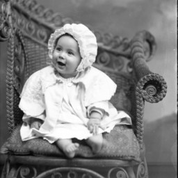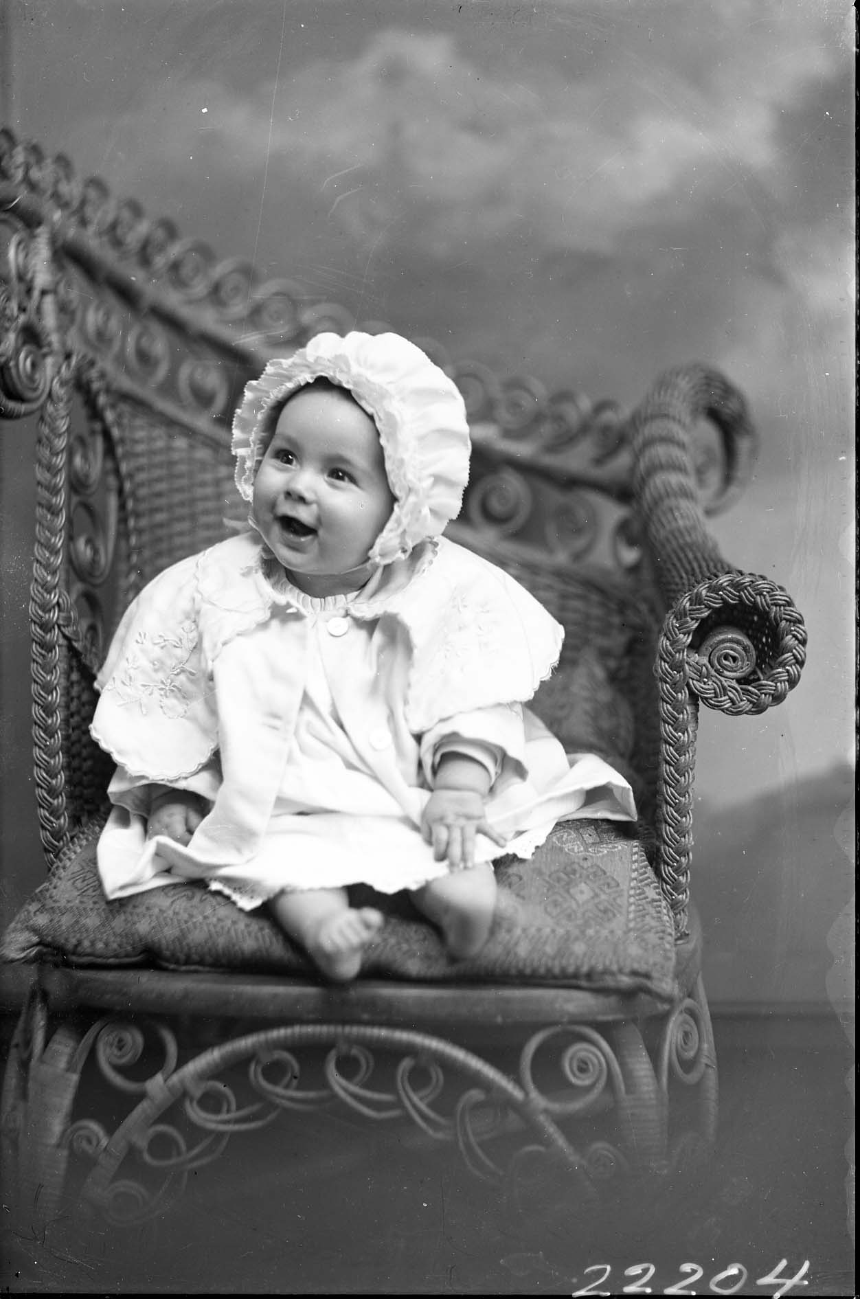 Unidentified, barefoot, young child is wearing a bonnet and is seated on a wicker chair.