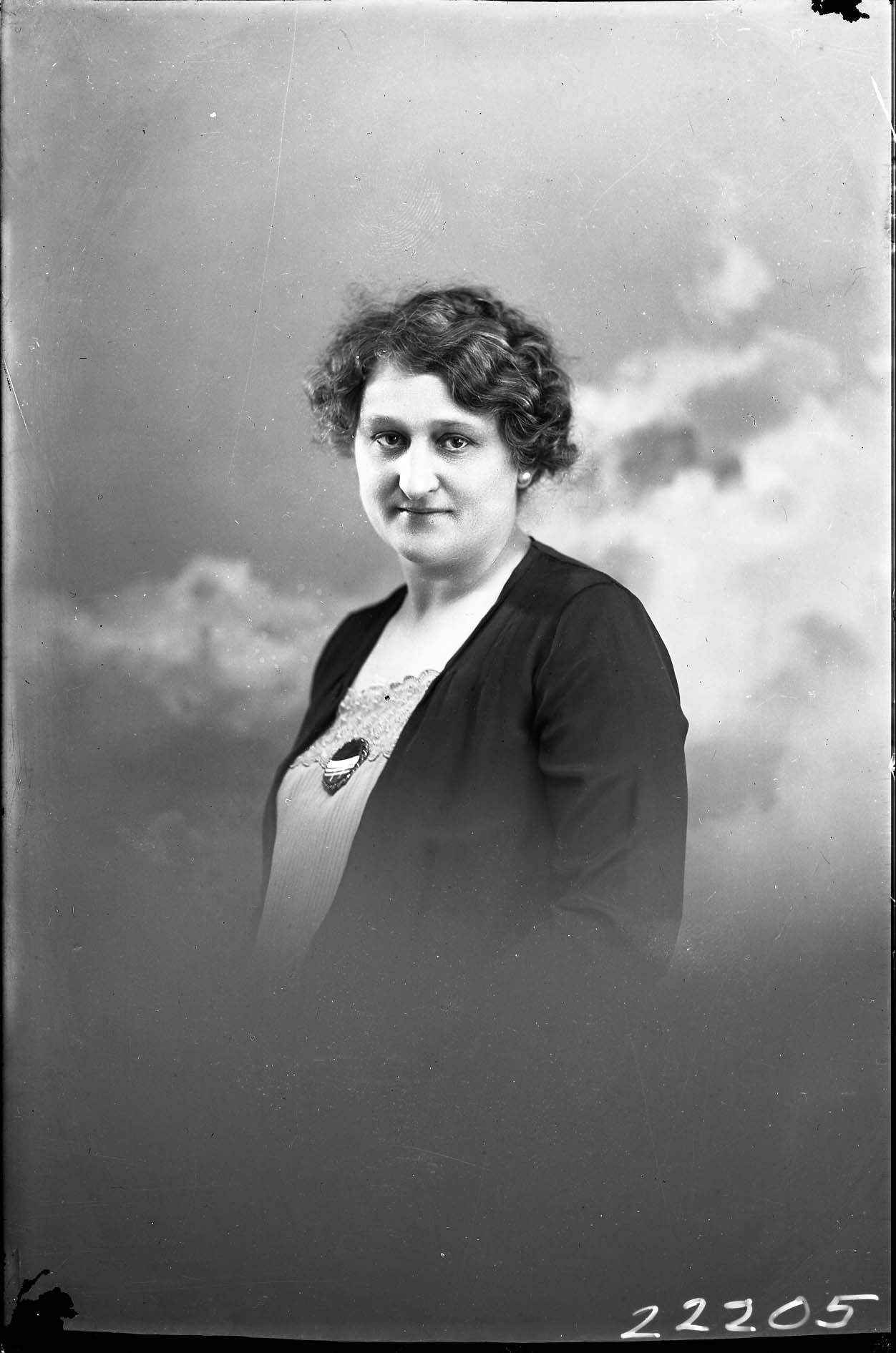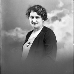 Portrait photograph of an unidentified woman with wavy hair and wearing a jacket over her dress.