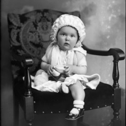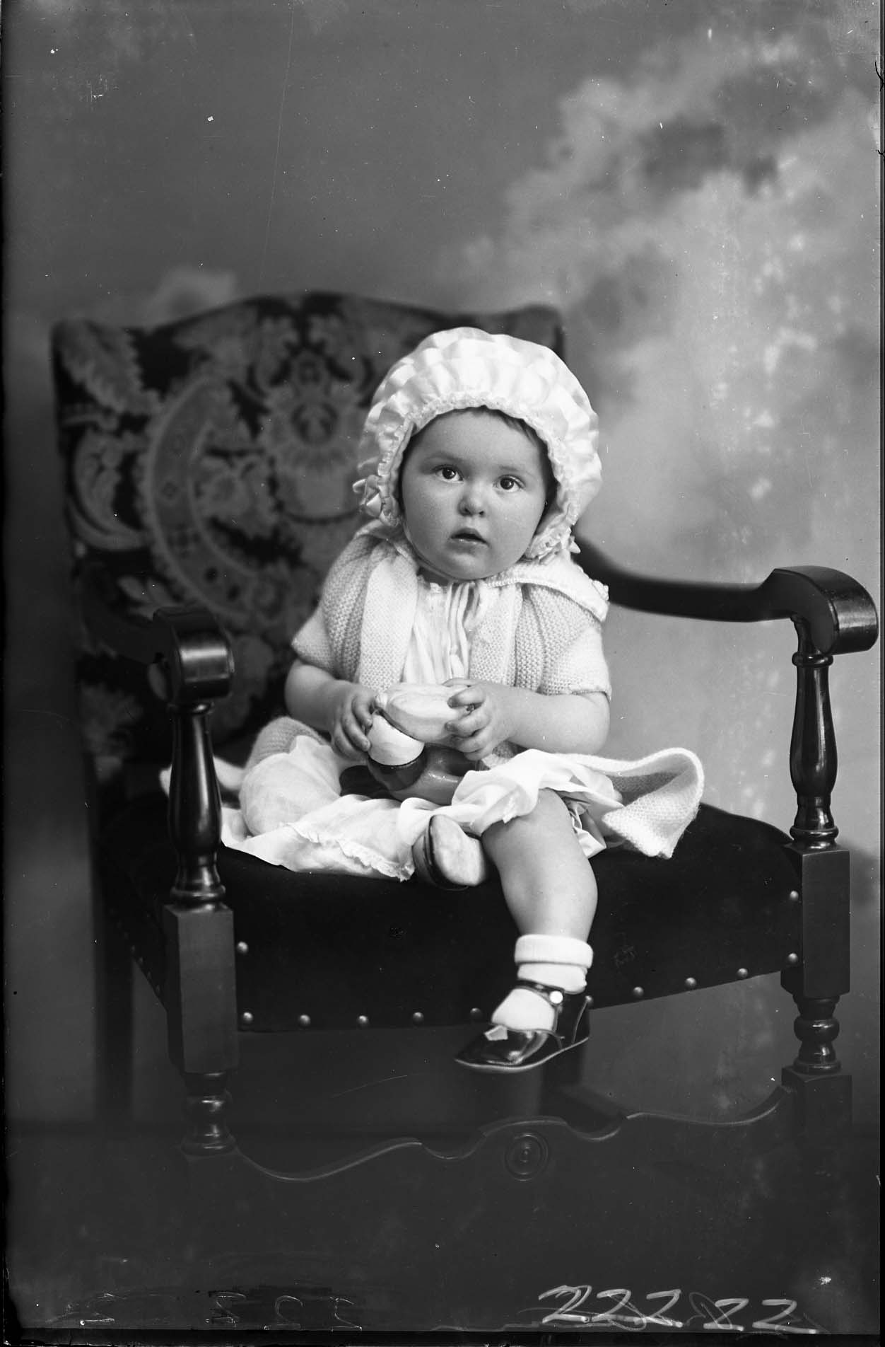 Unidentified young child wearing a bonnet is seated on a chair and holding a toy.
