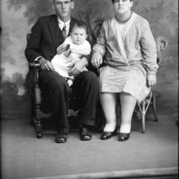 Unidentified man in a suit and tie is seated with a baby on his lap and an unidentified woman seated beside him.
