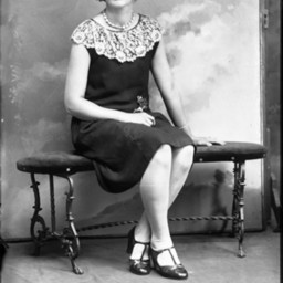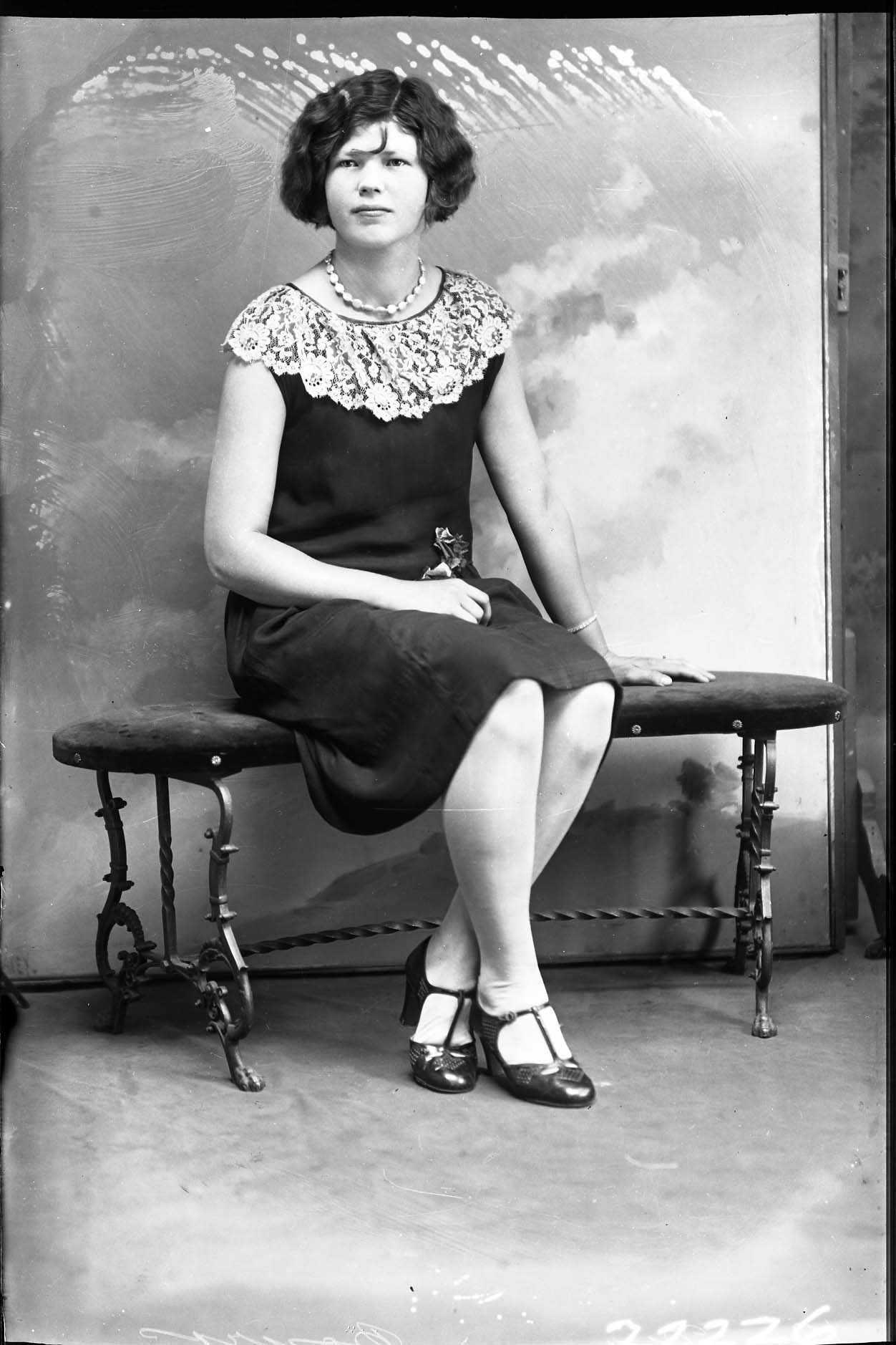 Unidentified woman with short hair and wearing a dark dress with a white lace collar, is seated on a bench with her ankles crossed.