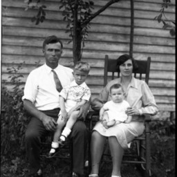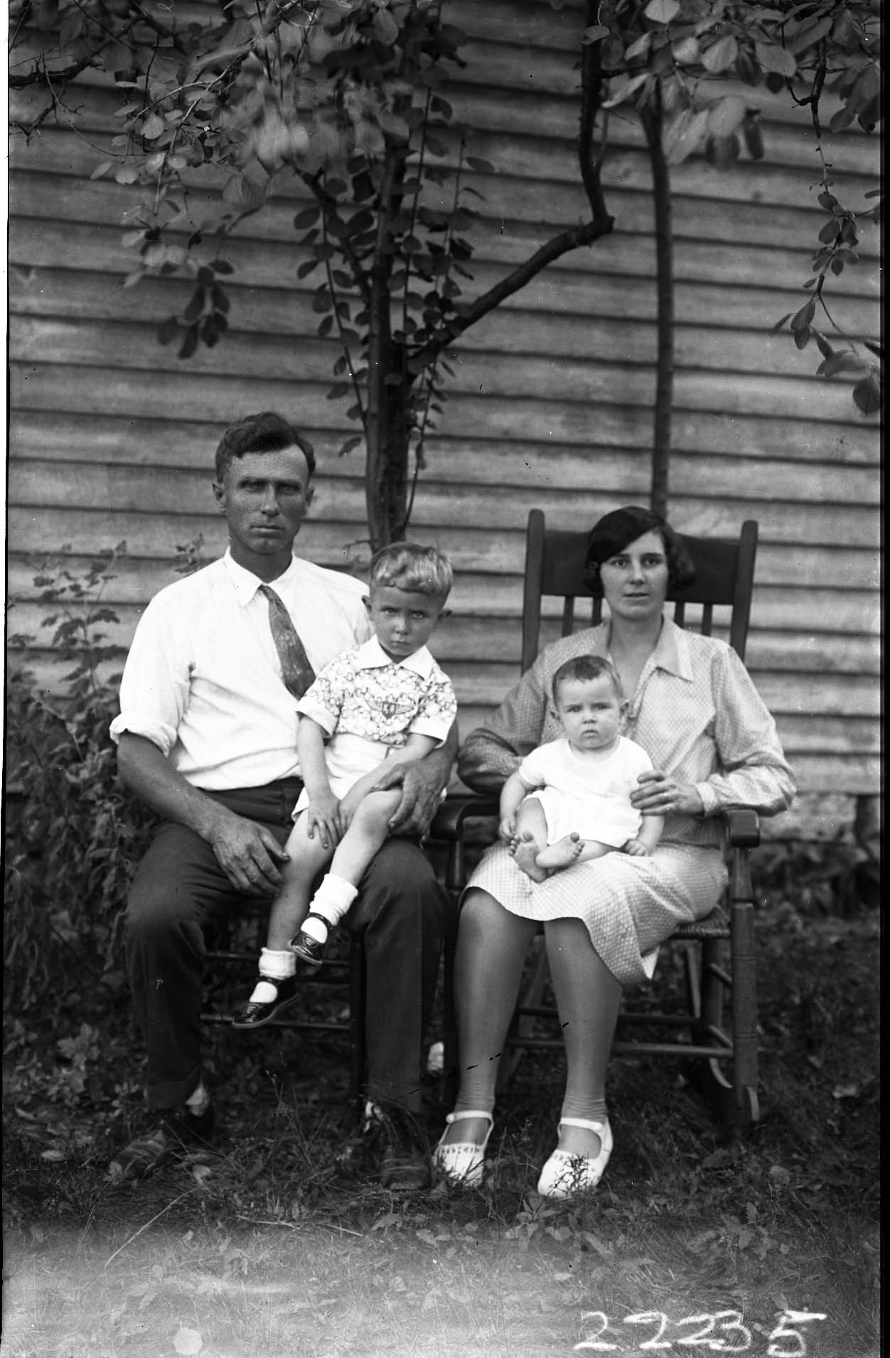Unidentified man and woman, seated outdoors, both with an unidentified child on their laps.