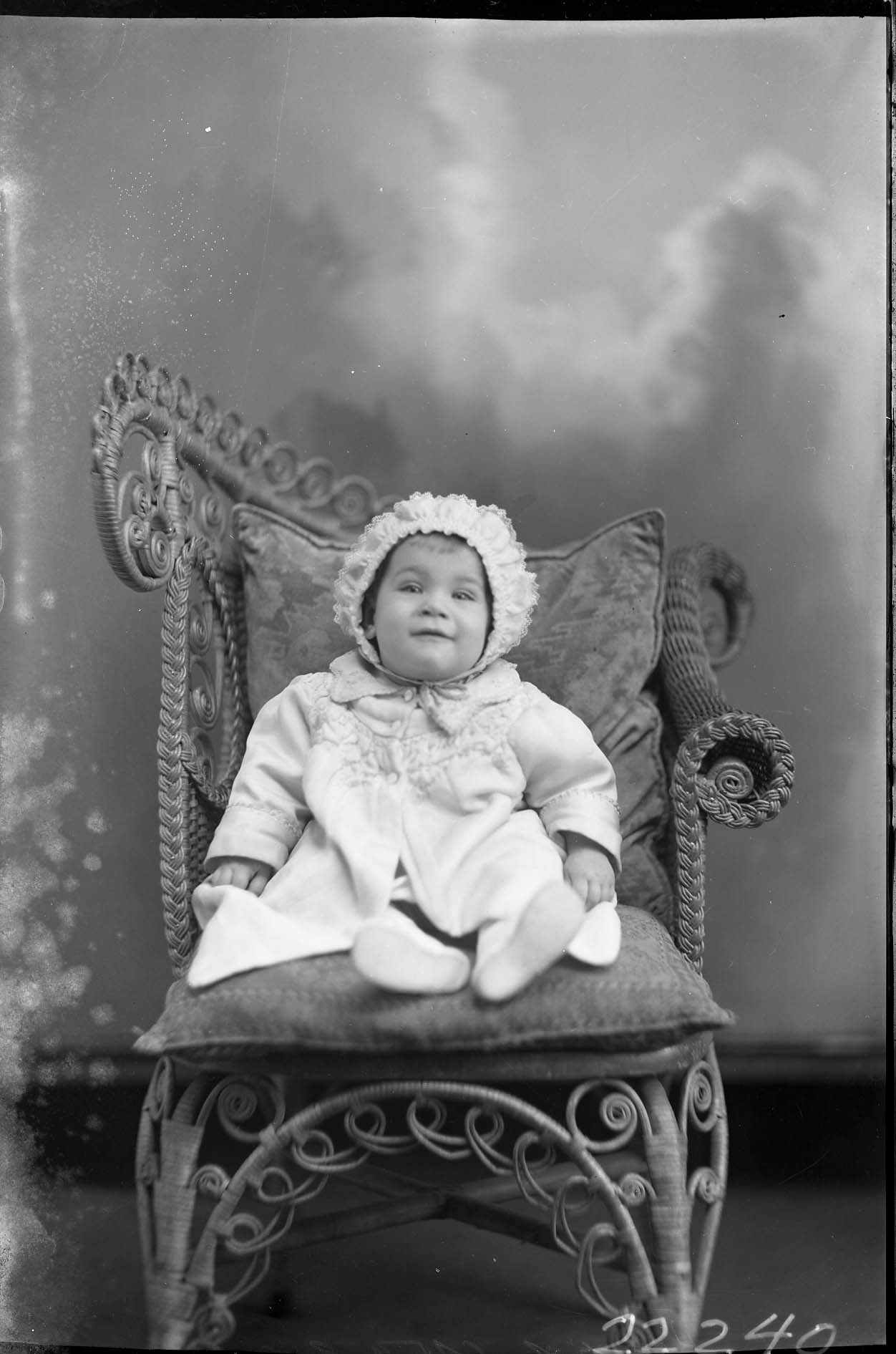 Unidentified toddler wearing a bonnet is seated on pillows on a wicker chair.