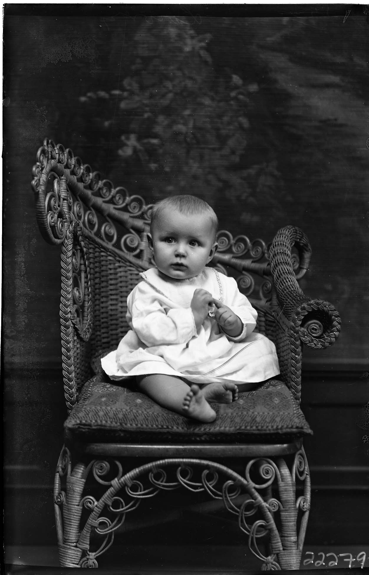 Unidentified barefoot baby is seated on a wicker chair.