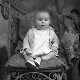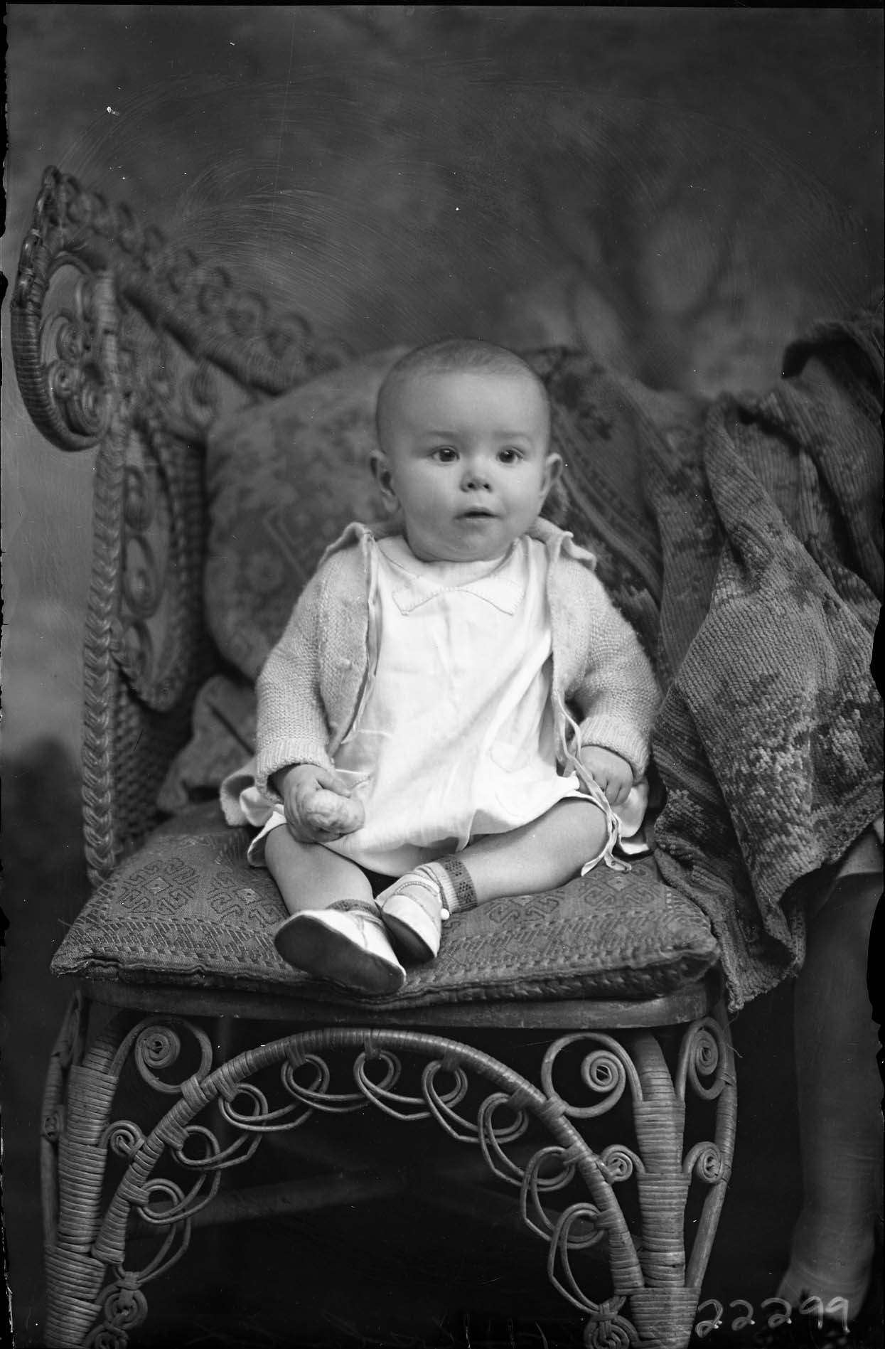 Unidentified toddler seated on a pillow on a wicker chair.