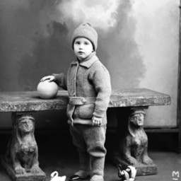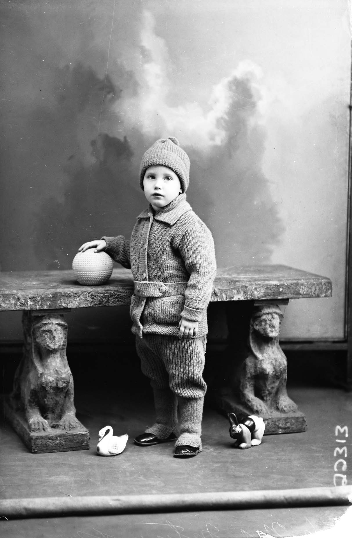 Unidentified young boy in a wintry outfit and hat is standing by a bench and toys.
