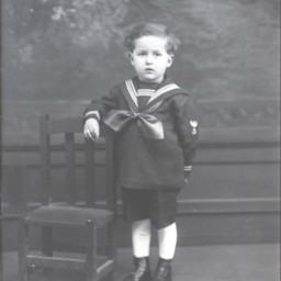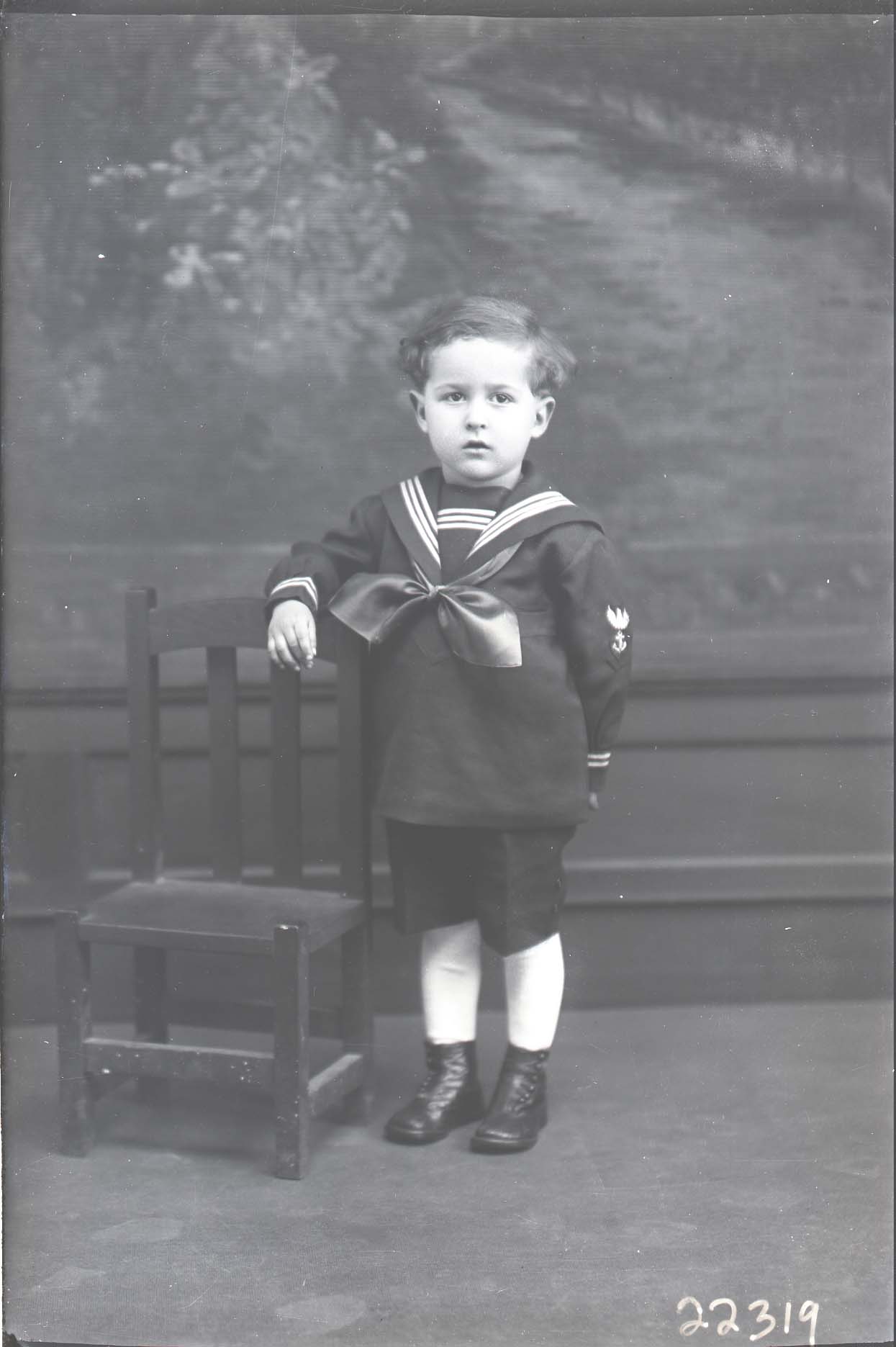 Unidentified young boy is standing by a child-sized chair and wearing a sailor-themed outfit.